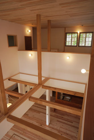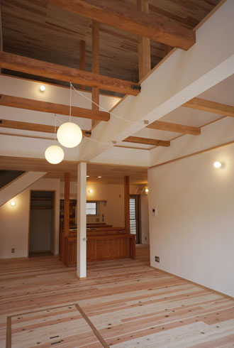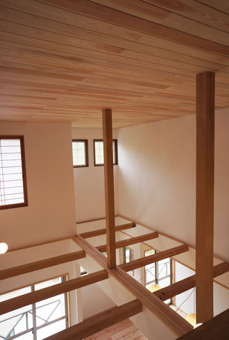 - 吹抜けを設けることで、2階の窓からの明りが室内に届くようにしました。