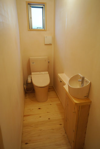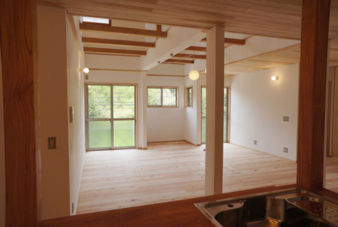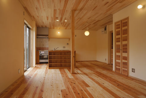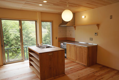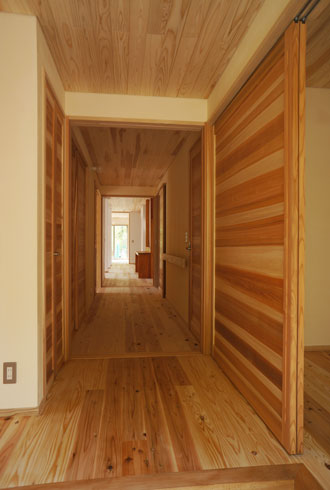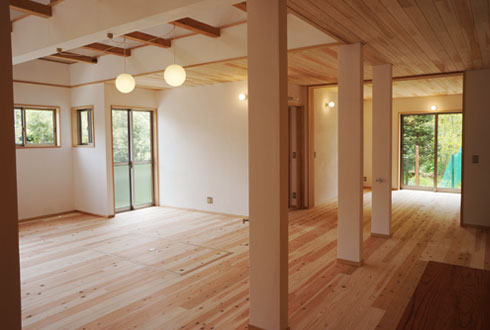 床/杉フローリング、壁/モイス(下地)タナクリーム仕上げ、天井/1階:杉羽目板張り一部2階床あらわし・2階:杉羽目板張り、玄関/モルタル木コテ仕上げ、床塗装/自然塗料(みつろう)、建具/木製製作建具、階段/桧板 |