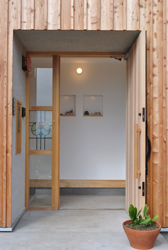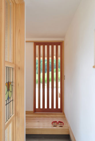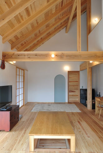 | 内部仕上 | 床/杉フローリング、壁/モイス(下地)+漆喰、天井/杉羽目板張り、玄関・土間/色つきモルタルコテ仕上げ、床塗装/自然塗料(蜜蝋ワックス)、建具/木製製作建具 |