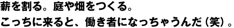 「ずっと外で土木作業(笑)。薪を割って、草刈りして、木を植えて…泥だらけになって働いている。でも、それが楽しいんだ。」