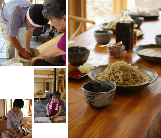 今日はおばあちゃんが自慢のお蕎麦を打ってくれる。こね鉢はずっと昔から使ってきたものを持ってきた。おじいちゃんが使っていたのし板は、大工さんに削り直してもらった。古くからある道具を大事に使っているのだ。八ヶ岳という最高のロケーションで、みんなが手伝って打った蕎麦を食すのは、また格別の美味しさだ。