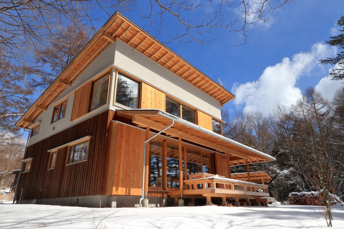 浅間山麓の国有林が迫る標高1,000m付近のお家です。晴天の雪景色という贅沢なコンディションの中、森の中に佇む美しい姿と、暖かな陽射しが差し込むリビングを、存分に撮影することができました。リビングの中心に土間と薪ストーブを配置したり、軒を深く延ばしてデッキを広く確保したりと、ゲストを楽しませる要素に溢れたお家です。
