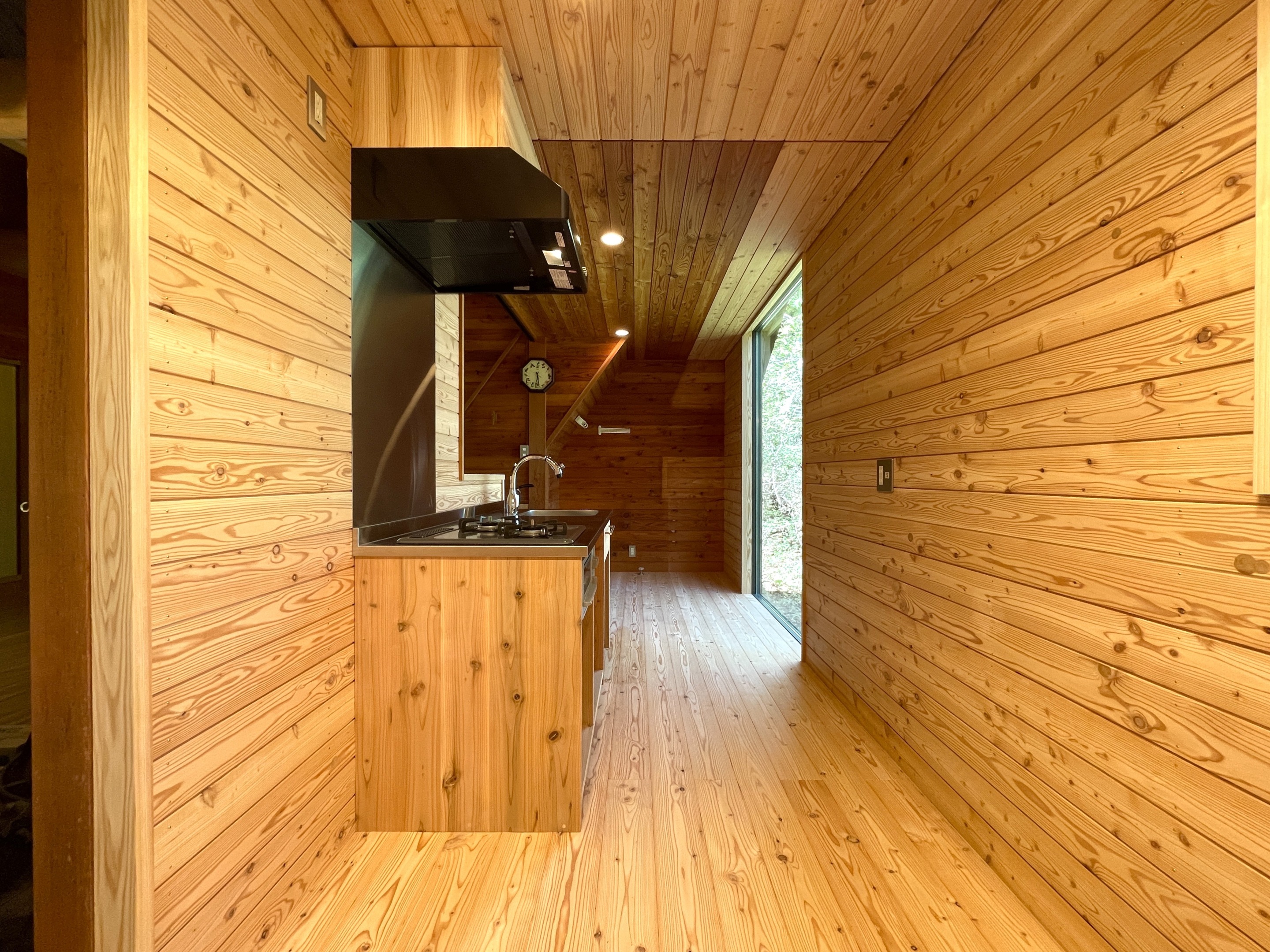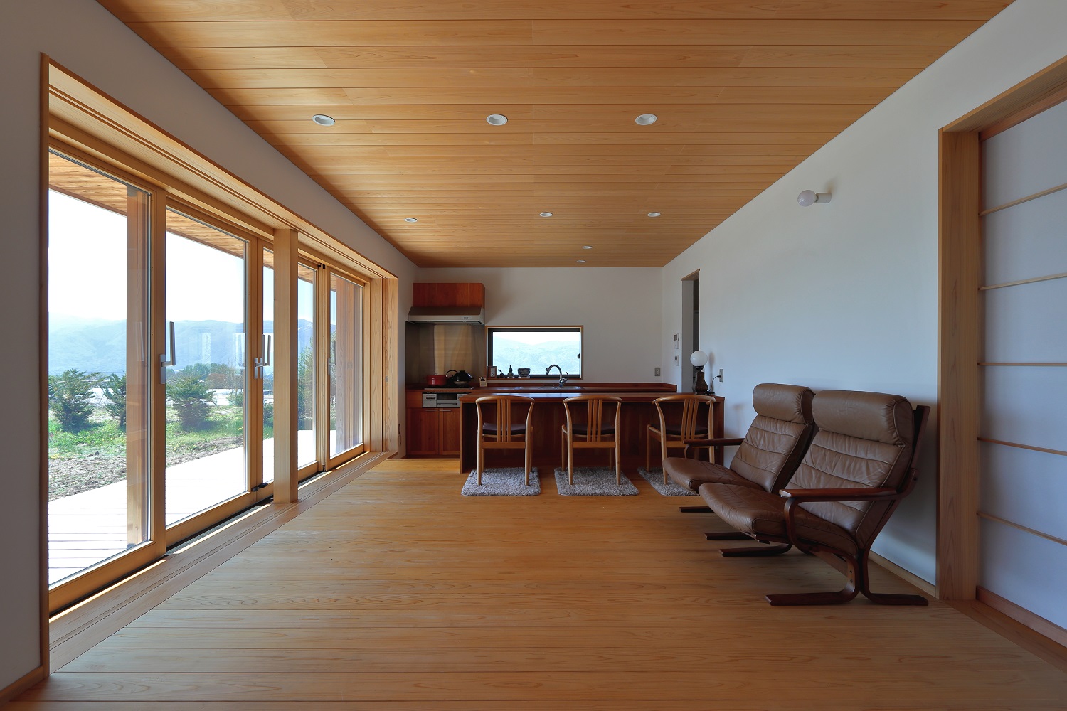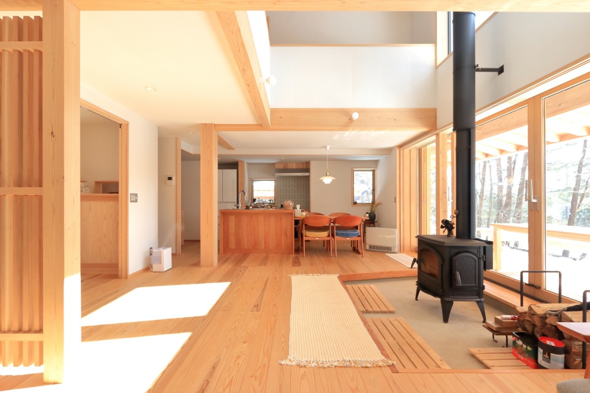 アトリエデフ八ヶ岳営業所近くに建つ『新・循環の家』。なんと、モデルハウス「循環の家 八ヶ岳」をベースに、オーナーさまのライフスタイルに合わせて小改良を加えたお家なのです。1階にはキッチンが配置され、フロア全体がパノラマデッキのような、明るく開放的なくつろぎの空間に仕上がっています。不思議なもので、ベースは同じでも、周囲の風景が異なったり、間取りが微妙に変化したりするだけで、別作品に見えてしまう面白さがありました。
