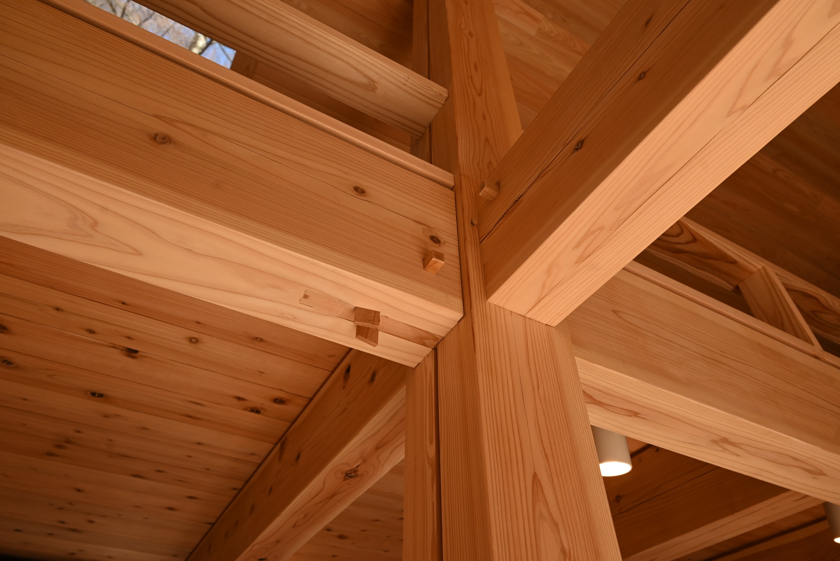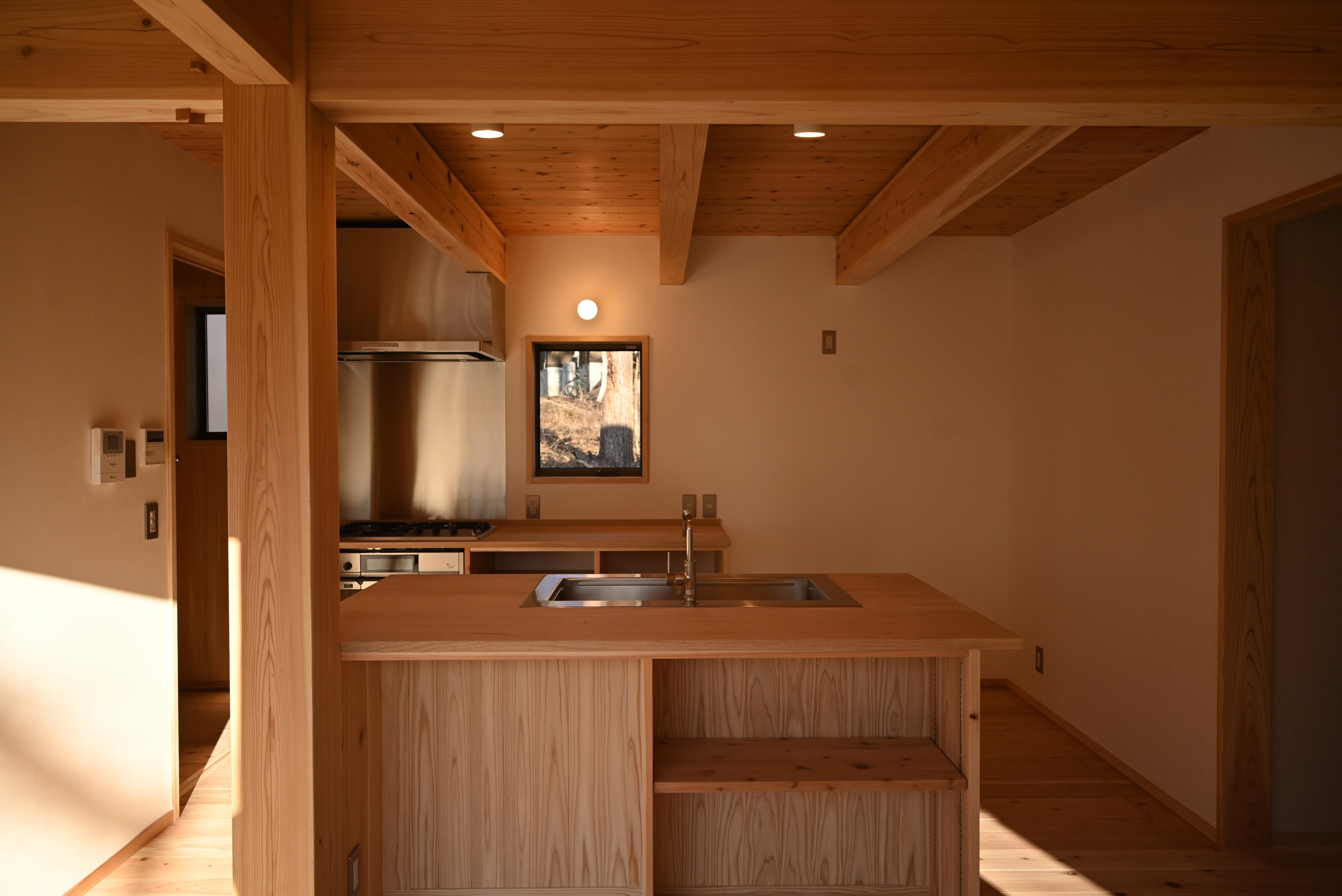 キッチン左側の立派な大黒柱や梁は、少しだけ木組みの栓を出したままにしてあります。