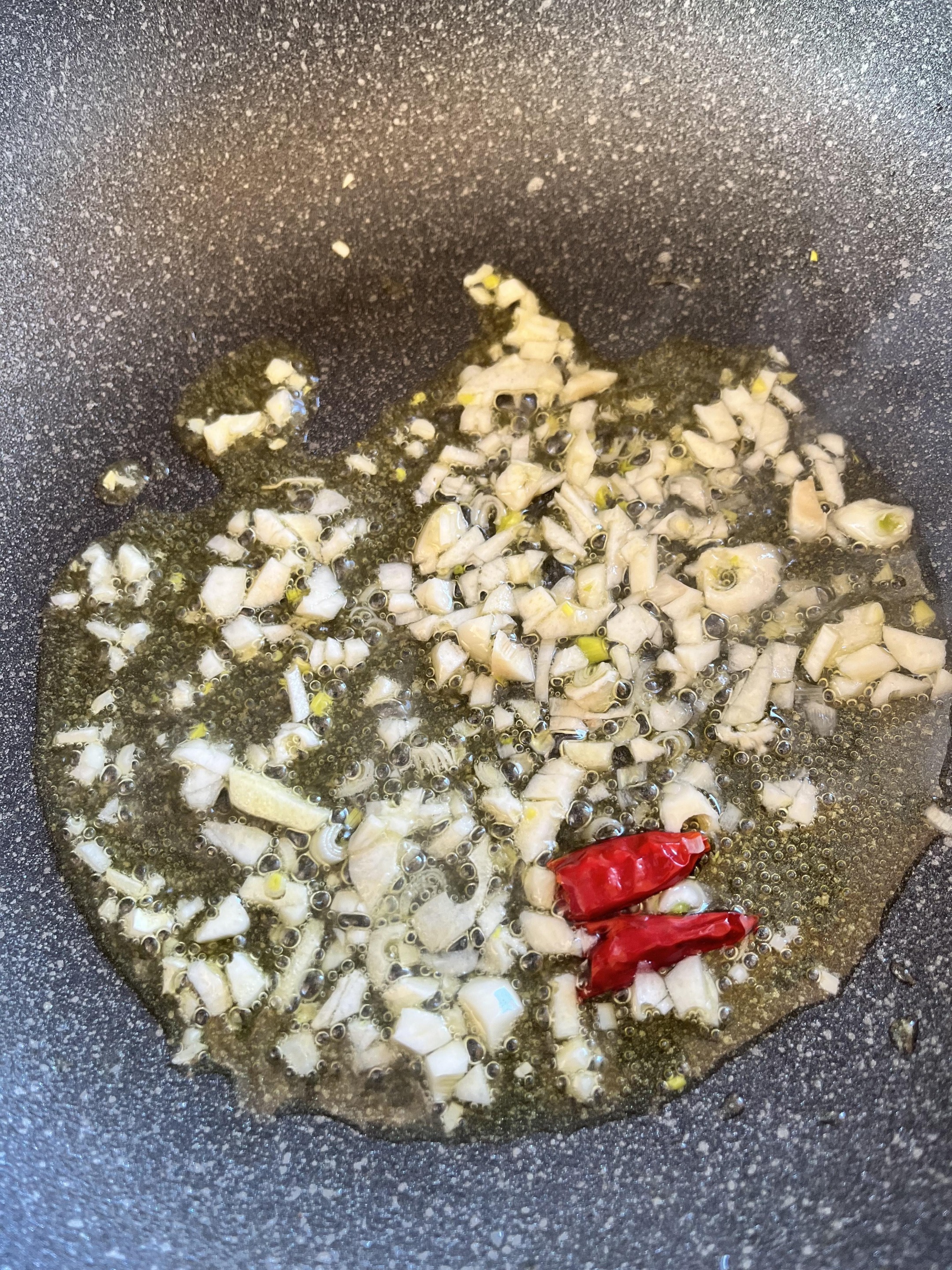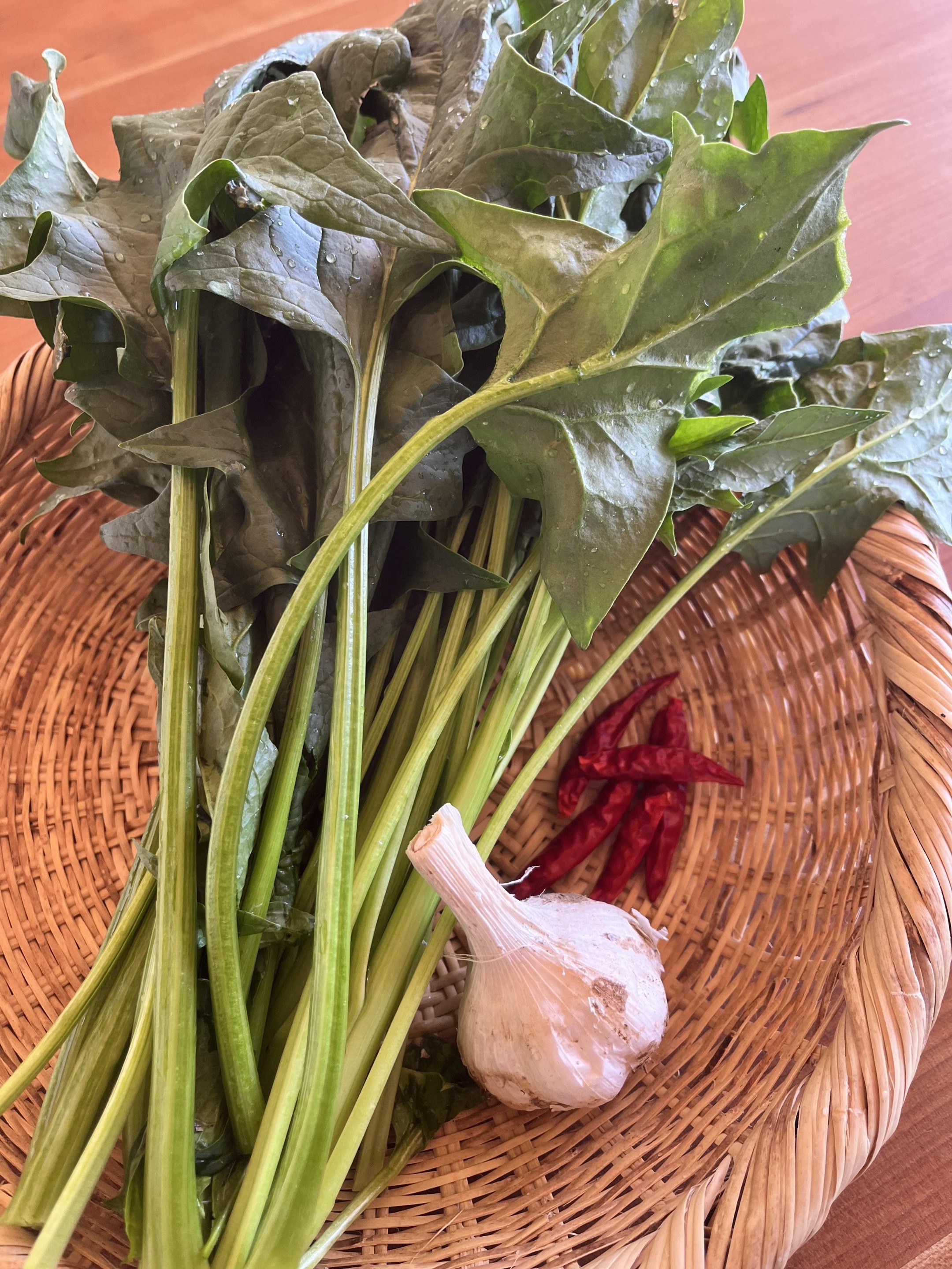 材料は我が家で採れた冬越しのほうれん草とにんにくと赤唐辛子。