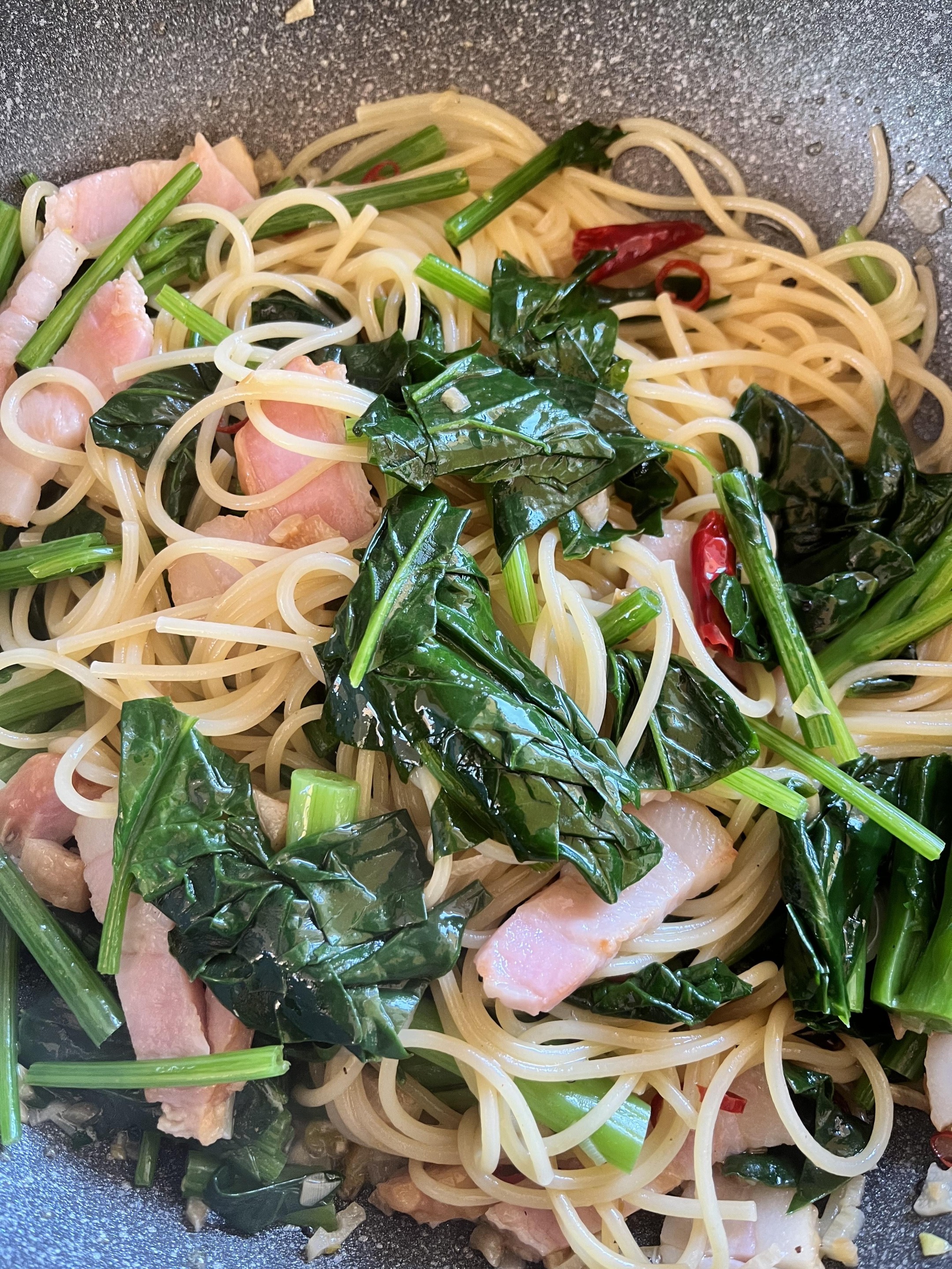 麺とベーコン以外は、私の畑で採れたほうれん草のペペロンチーノでございます。