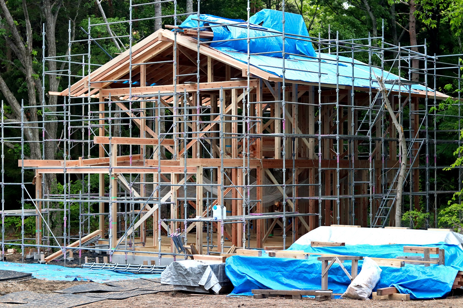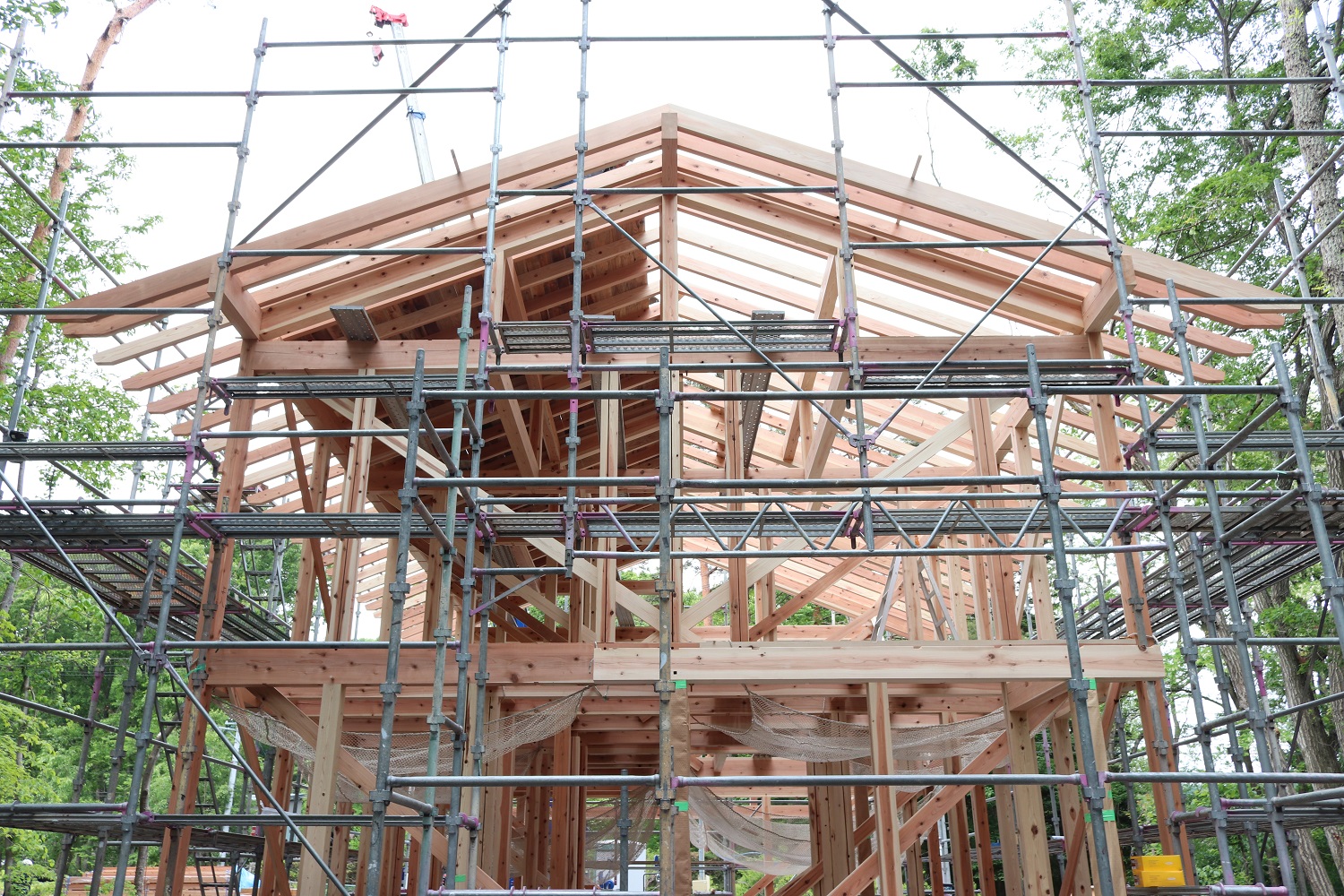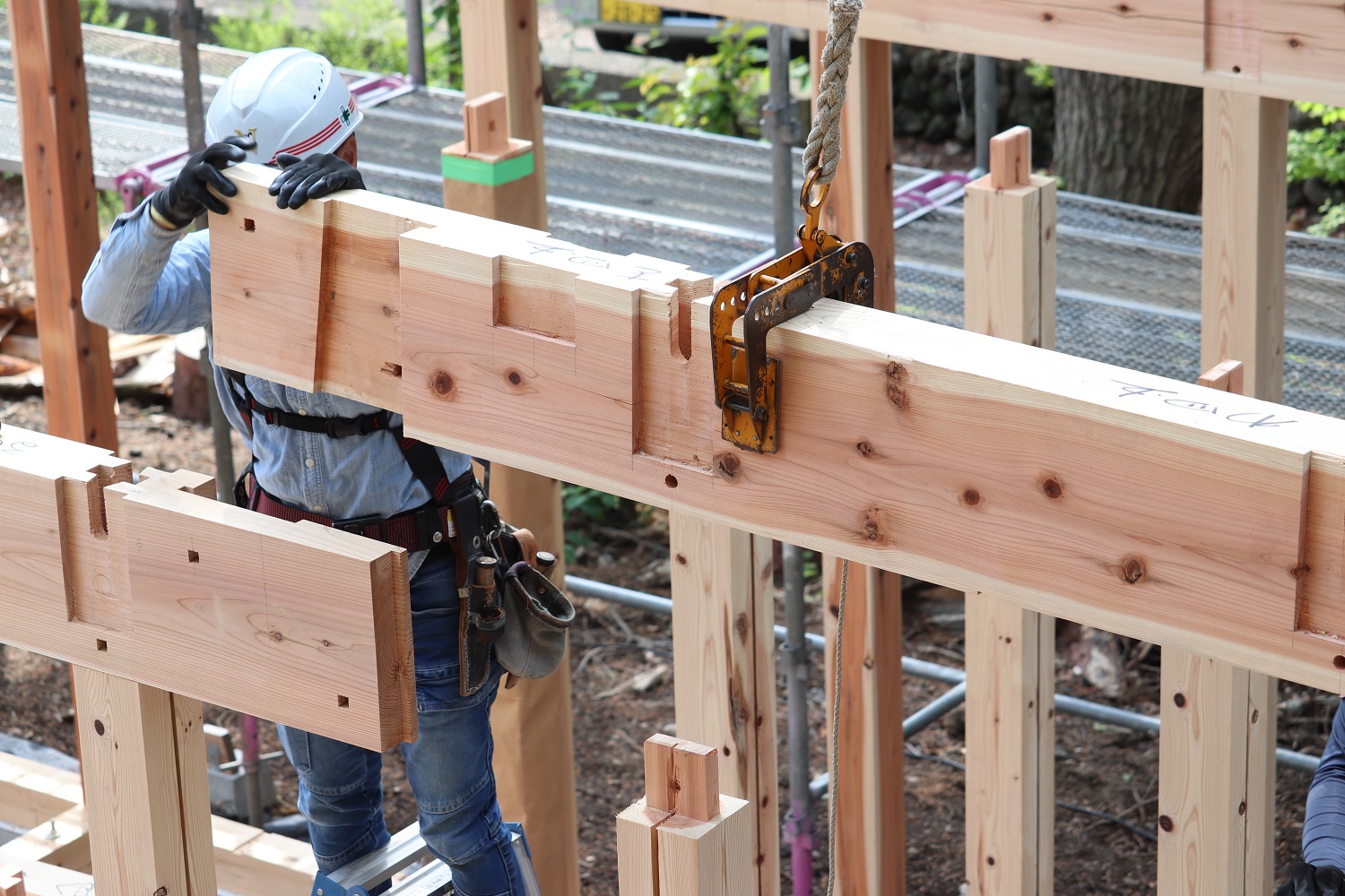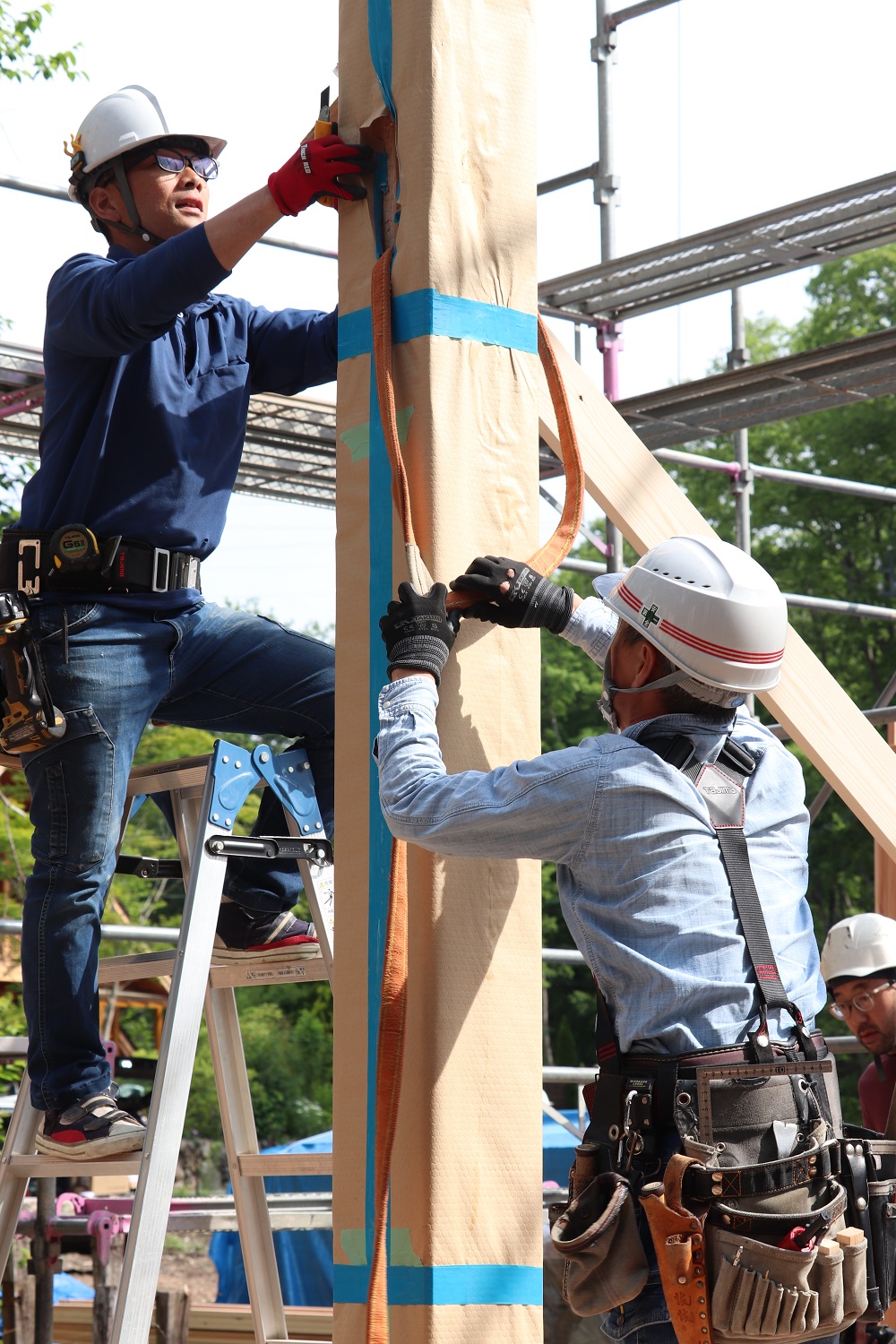 軽井沢の隣町である長野県御代田町で、Hさま邸の建て方が無事に完了しました。当日は群馬県から駆け付けて下さった田辺棟梁と、応援の大工さんたちが作業を進めて下さいました。午前の休憩までに1階部分が、お昼までに2階部分が、午後には屋根が順に組み立てられ、夕方にはお家のシルエットを把握できるようになりました。