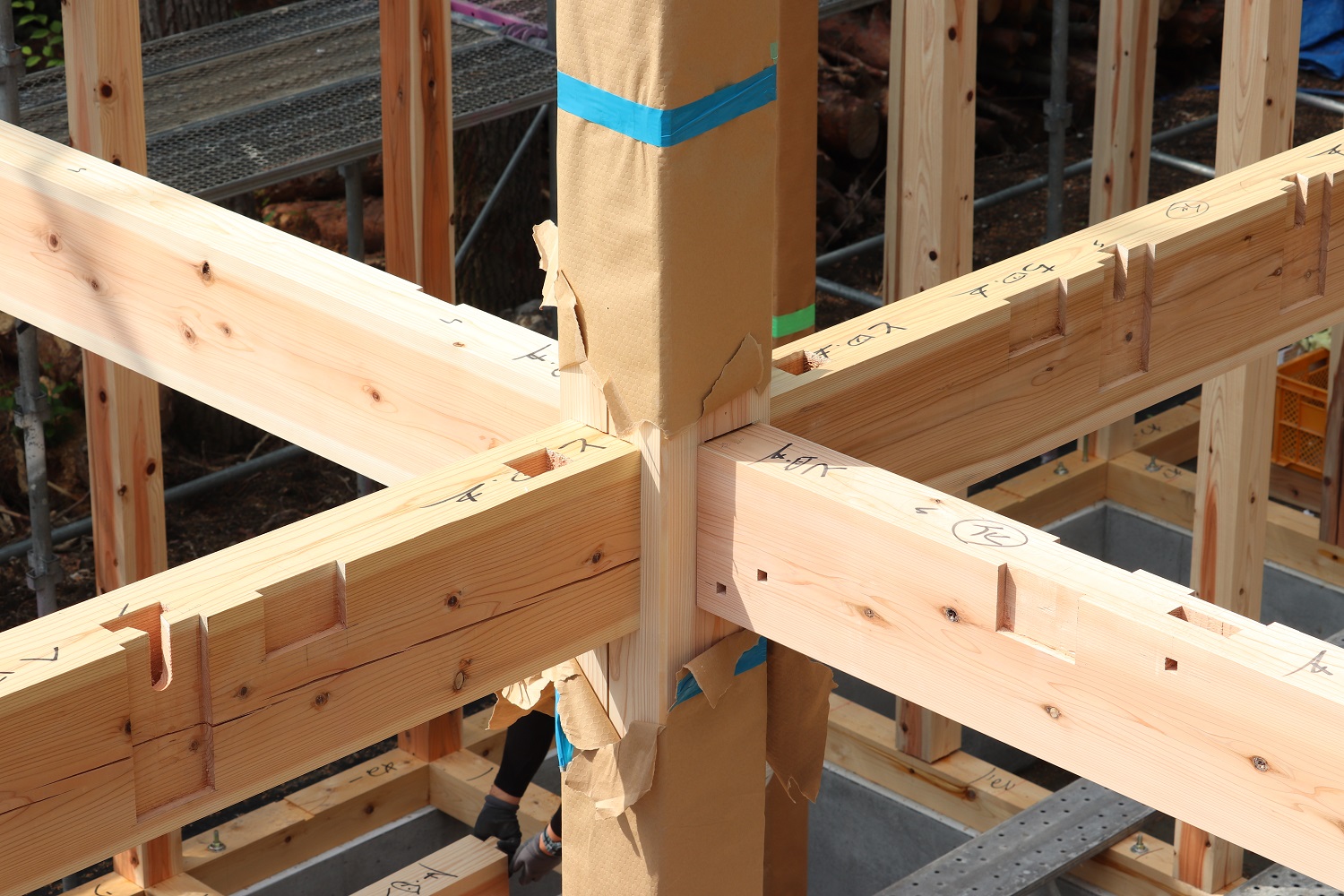 アトリエデフの家づくりは、トレーサビリティが明らかな、日本の山の木を使っています。そして、構造材の「継ぎ手」と呼ばれる接合部には、木組み建築の要となる仕口が、大工さんの手刻みによって造作されています。それらを組み合わせ=噛み合わせることで、地震に耐え得る、しなやかで強固な木組みの家づくりが実現しています。