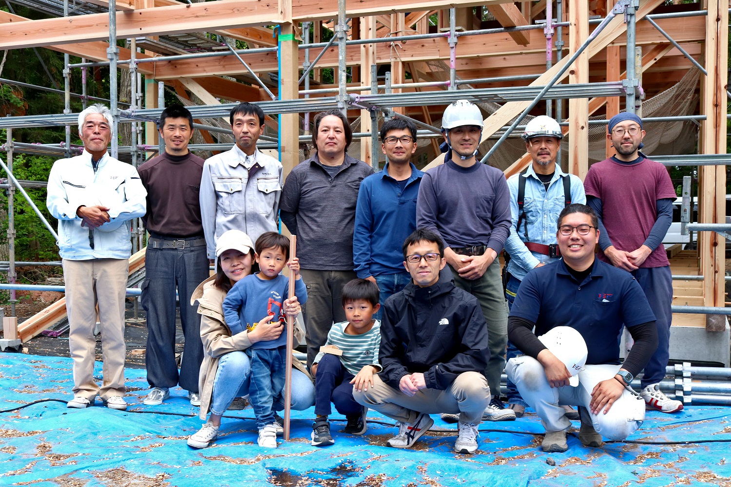 最後はお施主さまを交えて、みんなで記念撮影です。「集合写真撮ります!」「マジか!?」という雰囲気の中で、大工さんたちも笑顔で並んで下さいました。大工さんの手で造り上げる家づくりは、木の生命力と大工さんのパワーが融合しているようで、いつ見ても惹かれるものがあります。