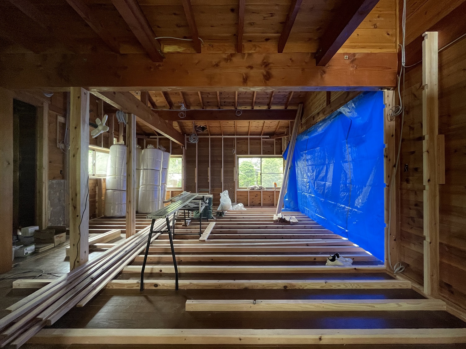 まずは、家族が集い、寛ぐ場所となるLDK方向を拝見します。既存のキッチンや薪ストーブ、階段、南側開口部が撤去されてガランとしています。リノベーションに向けて空間が一旦リセットされたことを意味しており、ココから計画図面に基づいて新たな間取りが組み上げられていきます。既存の床の上に根太が等間隔で流されています。今回の施工では床の解体は行わず、根太間に羊毛断熱材を敷き詰めた上で、床面の嵩上げを行います。