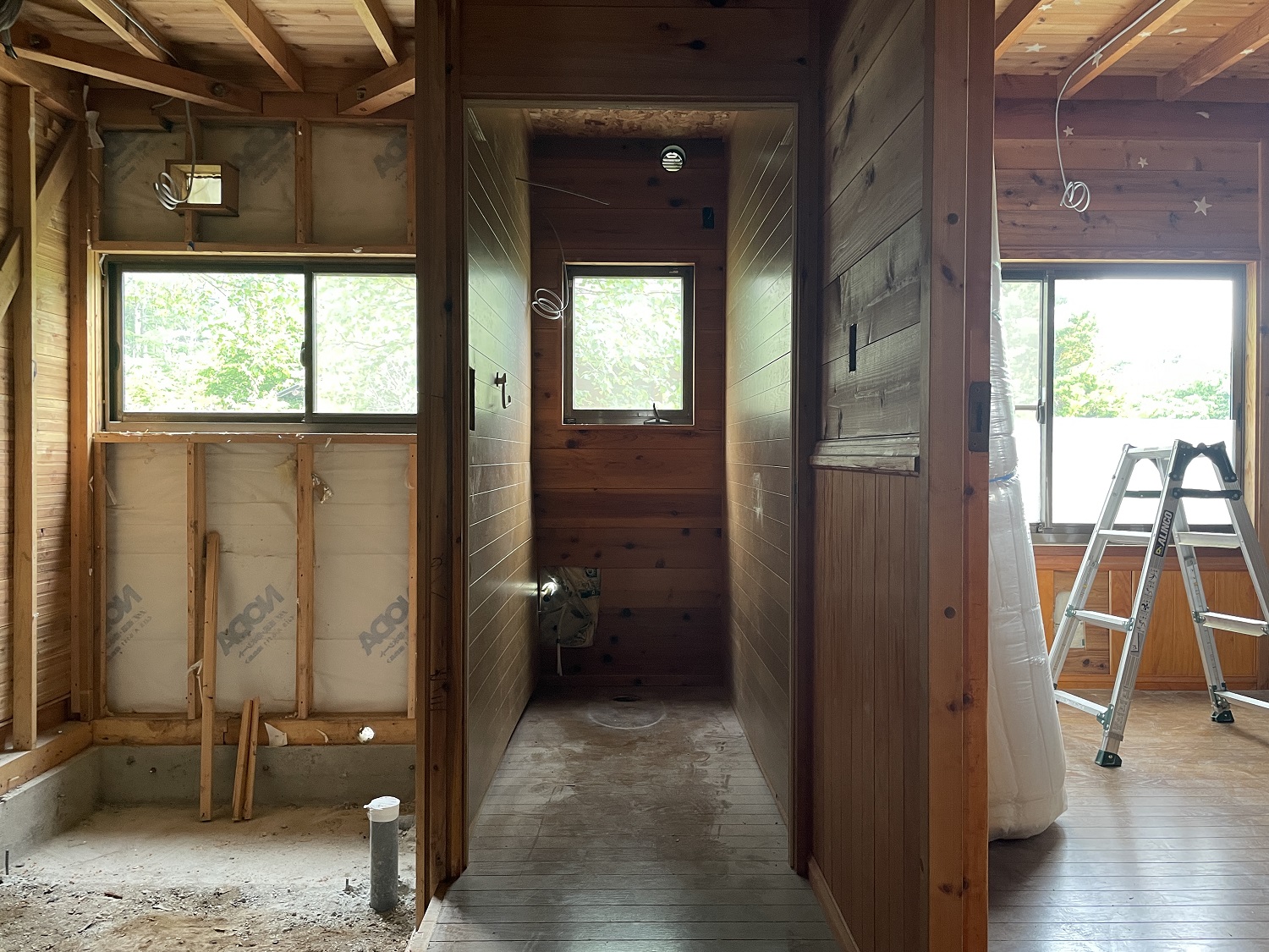 水回り全般にもリノベーションが及びます。既存の浴室・洗面設備、トイレ便器ユニット等は取り払われて、こちらも空間がリセットされています。浴室は今後、檜の板に囲まれたハーフユニットバス仕様の空間に変化を遂げようとしています。脱衣室からお手洗い、そしてクローゼットへと繋がる動線も楽しみなエリアです。