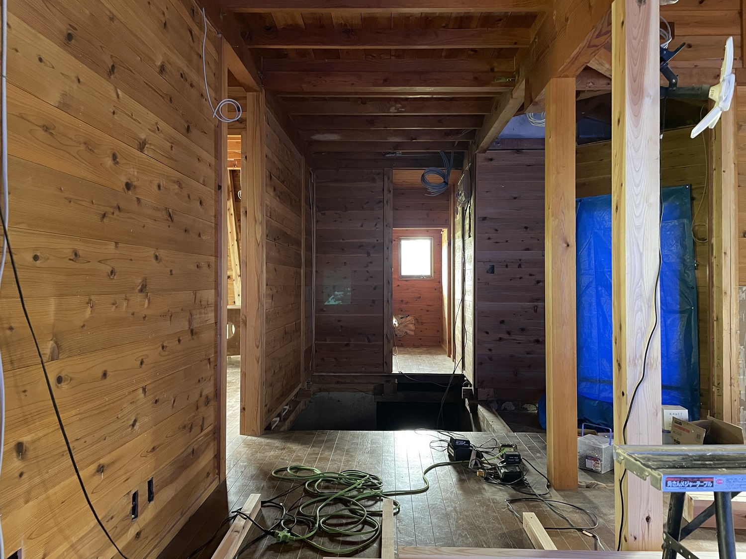 ちなみに、画像に見えている新しい木材たちは、すべて日本の山の木です。新築と同様に、適正に保全されている日本の山から切り出した木を、リノベーションの現場にも適用しています。化学的な薬剤処理を施さない、安全・安心な建材を全面的に使用している点も新築と同様で、住まう人や動物にとって「何だか心地よい空気感」を生み出しています。佐久穂町でのリノベーションは始まったばかりですが、日を追うごとに劇的な進化を遂げていく予定ですので、その模様を随時レポートできればと思います。お楽しみに!
