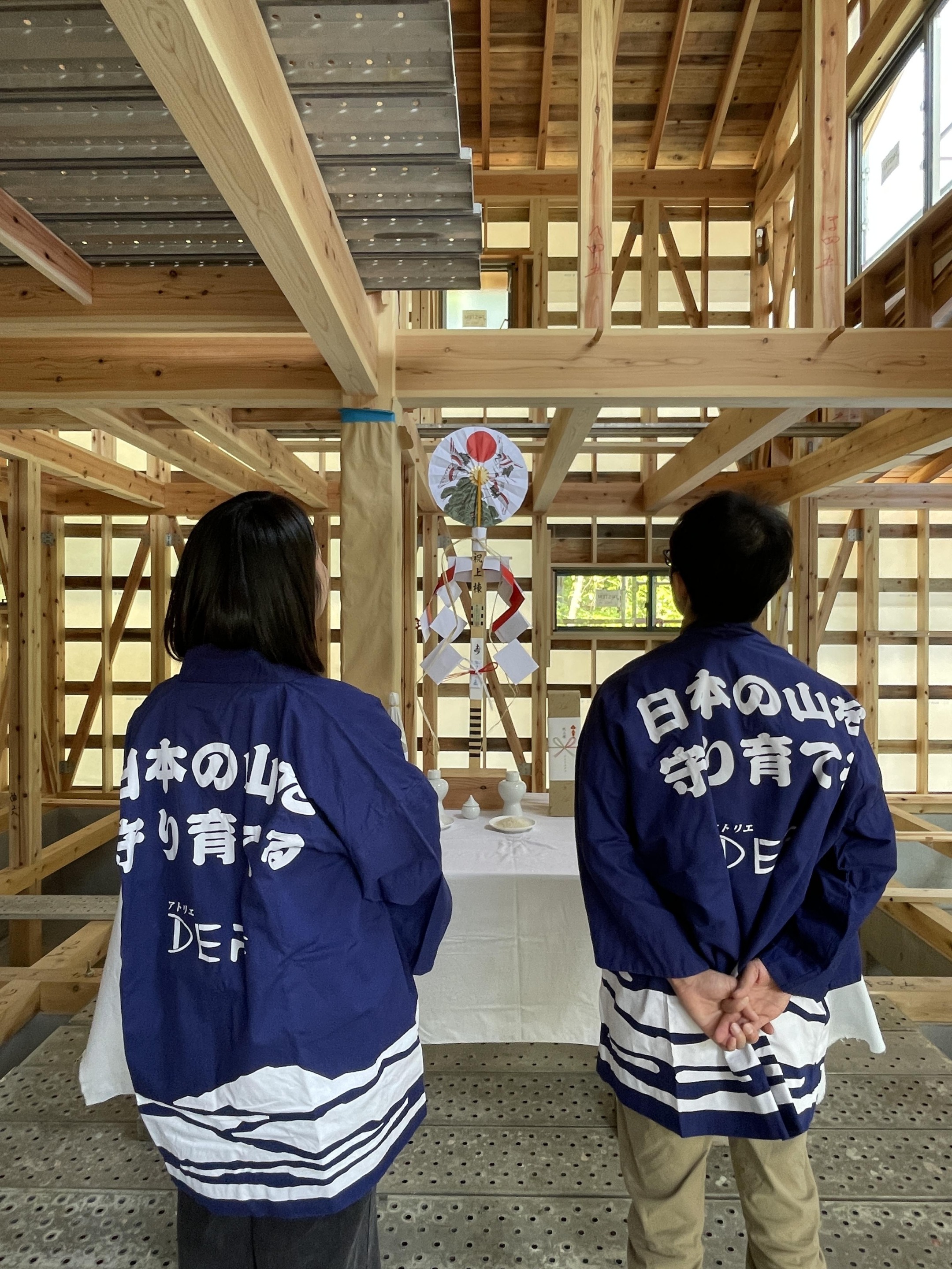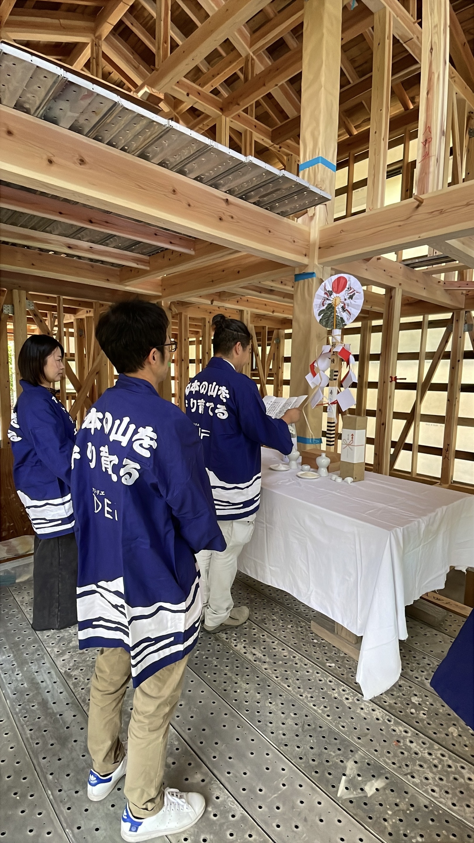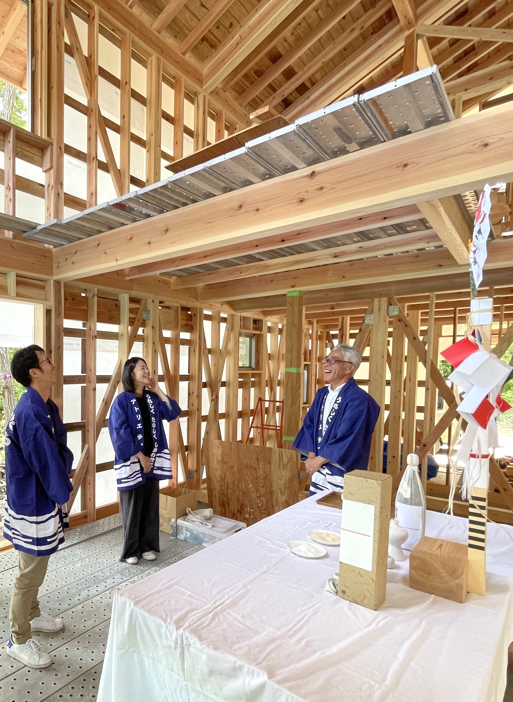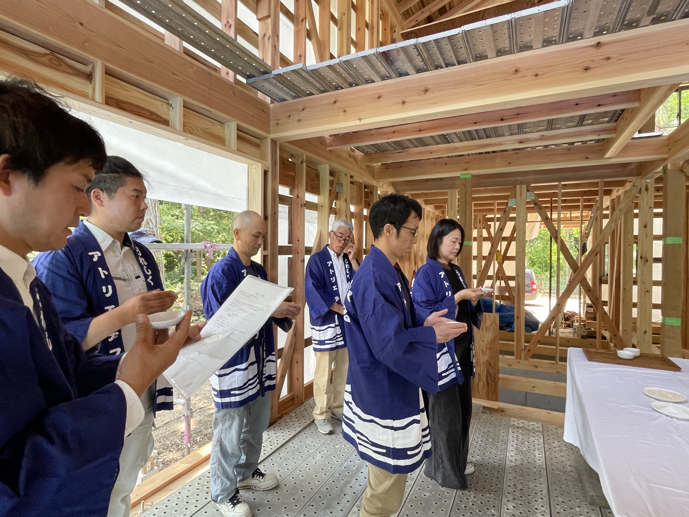 田辺棟梁に倣って祭壇に二礼二拍一礼で棟上げが無事に行われたことへの感謝と、今後の工事の安全と家内安全を祈る儀式を行いました。