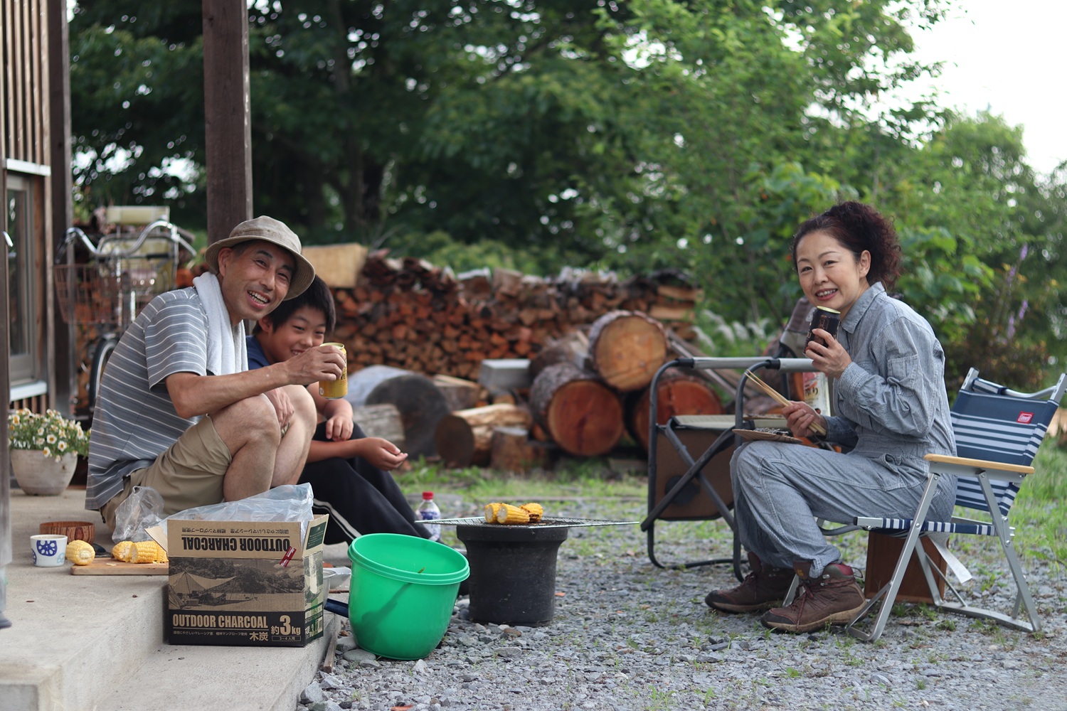 お隣さんの父子は、立科町の釣り堀に毎夏出かけます。良く釣れた日には、玄関先に置いた七輪でニジマスを焼いてくれて、我が家にも振る舞ってくれます。ウチのお庭とお隣さんのお庭は繋がっていて、自由に出入りできる間柄(こりゃ有り難い関係です)。この日も夕暮れが近付くと、ご主人から「一緒に七輪で焼いて食べませんか?」のお誘いが!畑仕事も程々に切り上げて、ビール片手に乾杯することになりました。