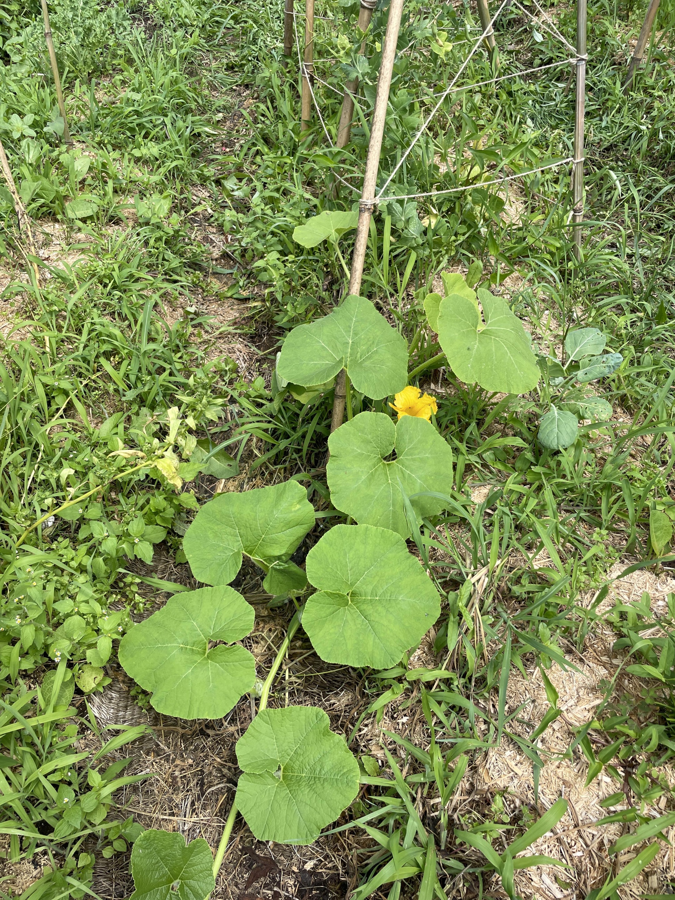 あと、スナップさんの横で、去年のこぼれ種から伸び伸びと大きくなっているかぼちゃ。
