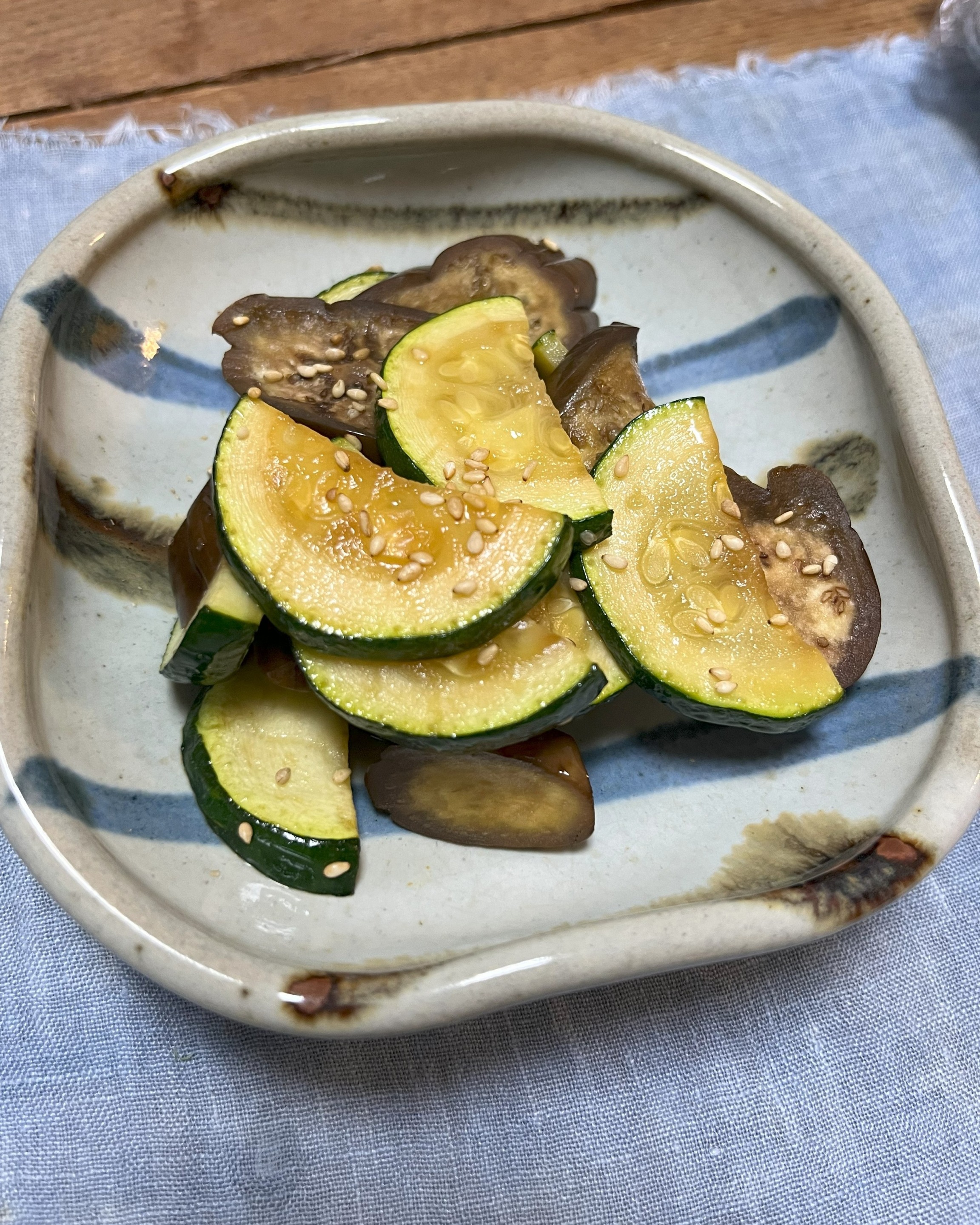 ぬか漬けにしたナスの漬かりが浅かったので、ズッキーニと一緒にごま油で炒めて、お醤油をたらり。