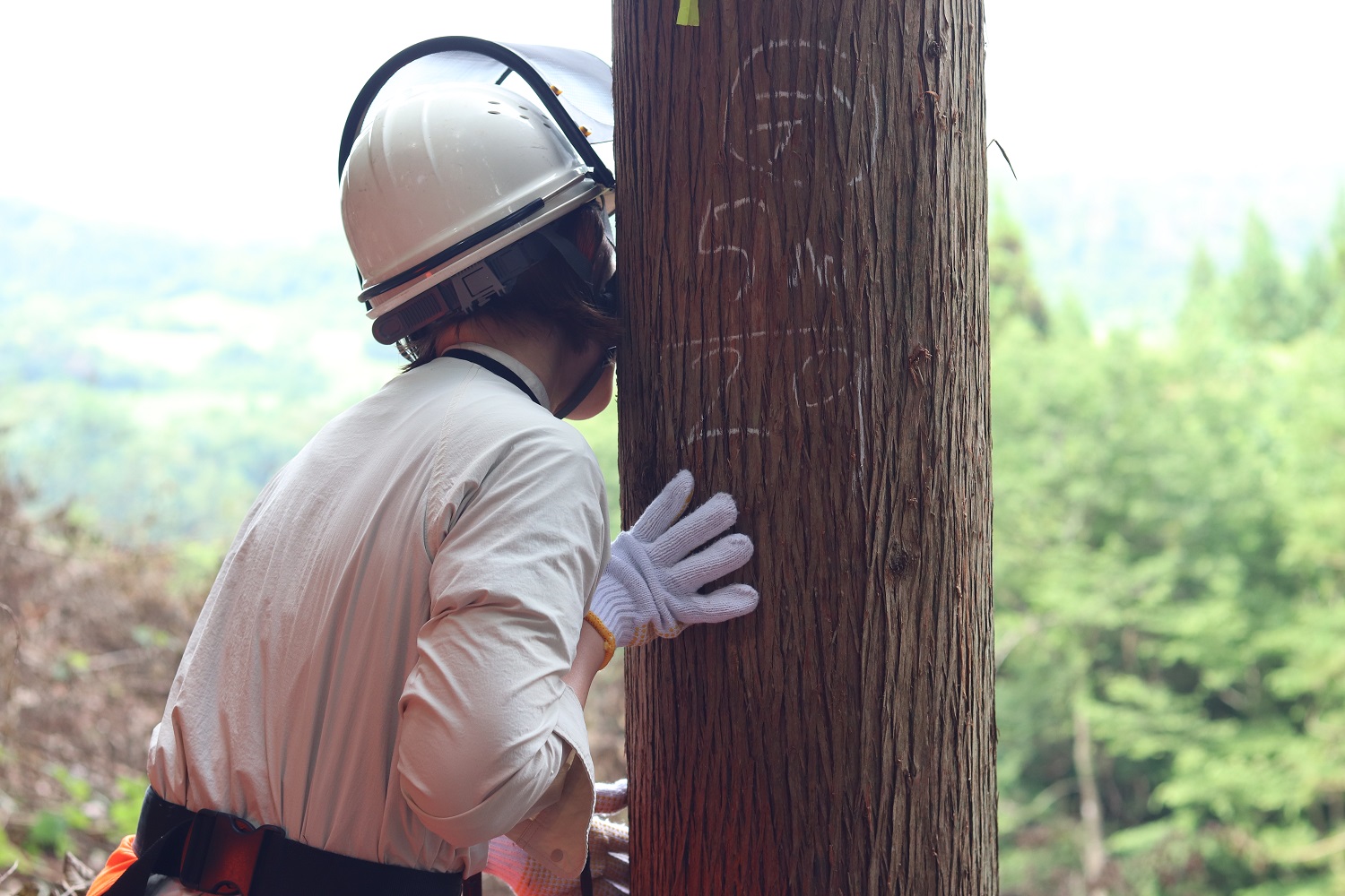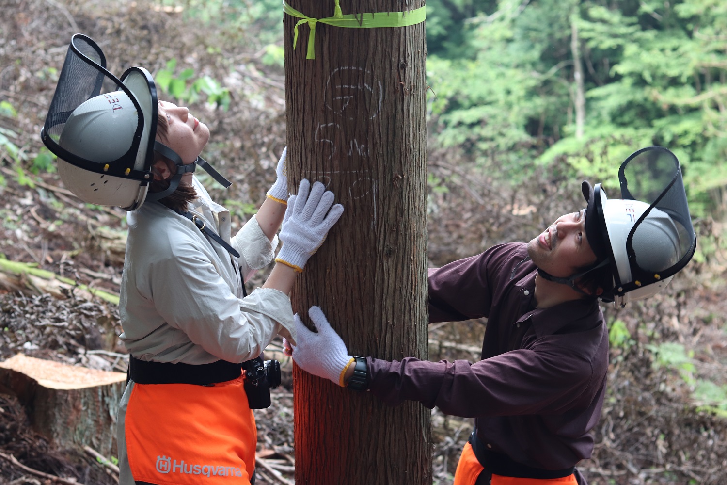 「さて、この2本でどちらにしましょう?」。KURIMOKUのAさんの掛け声で、Kさまご夫妻は2本の木の間を行き来しながら「こちらの木にします!」と宣言。「この木が我が家の大黒柱になるのだね!」と感慨深く、木にもシッカリと伝わるように声をかけています。そう、山の木=命をいただくわけですからね。何より「我が家の大黒柱として、大切に使わせていただきます」のご挨拶にもなっていますね!