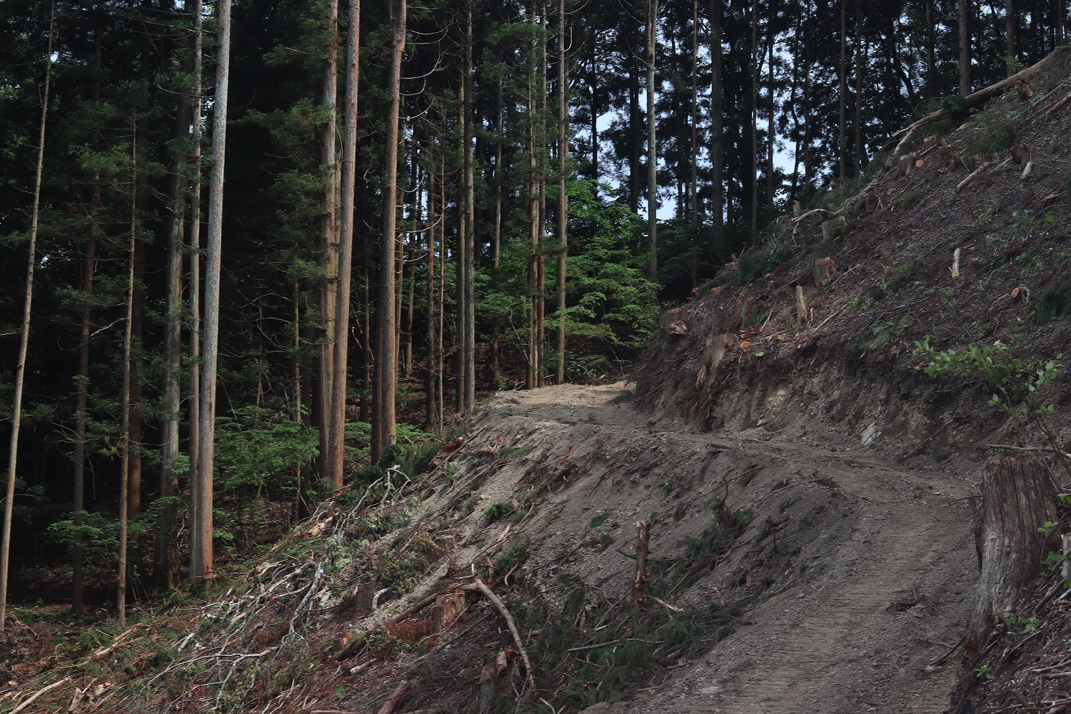普段は八ヶ岳営業所の駐車場でお会いするご夫妻に、岩手県一関市のドライブイン駐車場で会う意外性にお互いにビックリ(笑)。まぁまずは近くの町食堂でお昼ごはんでもご一緒しましょう(写真ナイのかい)!ご飯を食べた後は、いよいよ大黒柱に形を変える伐採木が植生する山へ向かいます。今回は“いつもの場所”でも、結構な奥地へドコドコ進んだ先に現場が潜んでいました。