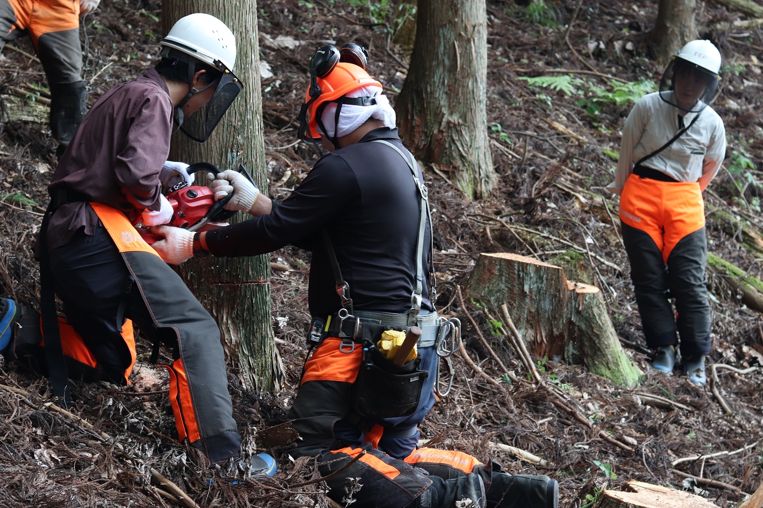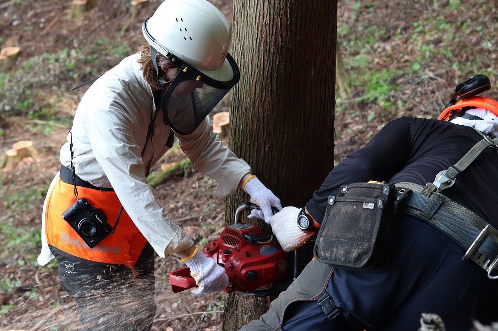 さぁいよいよ伐採作業に着手します。チェーンソーを力強く握って、まずはご主人からいきましょう!「ブィン、ブィン、ブィーーーーーン!ズゴゴゴコゴォォォォ!(頭文字D風)」と、山間にエンジン音をこだまさせながら、回転する鋭い刃で切り込みをスイスイ入れていきます。次いで、奥さまの登場です!こちらも木こりさんのサポートの下、スイスイ切り込みを入れていきます。ちなみに、奥さまが肩からブラ下げているのは、なんとフィルム式の一眼レフ。輝かしい今日の記録を、気持ちを込めて丁寧に撮り収めていらっしゃいました。