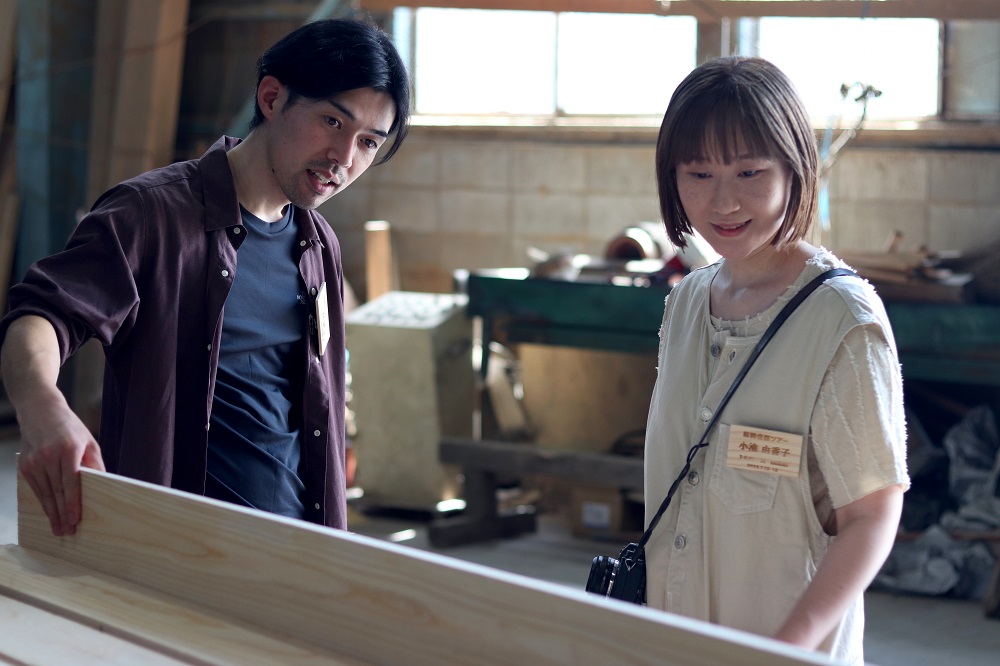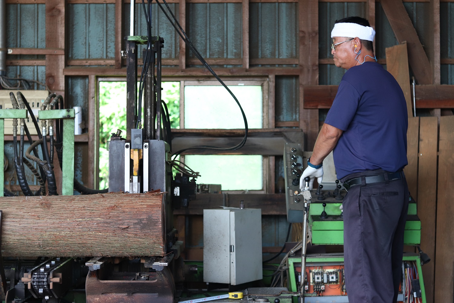 伐採木は当日の夕方までに加工場へ運ばれて、翌朝の製材作業に備えます。そして、夏の朝陽が照り付ける翌朝8時半には、横たわる伐採木が角材としての大黒柱に加工されていきます。4面加工を手際よく進める職人さんの姿、タオルの巻き方がカッコイイですね(ソコかいな!)。ゴロン、ゴロンと回転させながら、表面の皮を剥ぎ取っていくと、美しい木目が現れます。この美しい木目に手を触れると、シットリと瑞々しさが残っており、山の水を吸い上げていたことを実感できます。