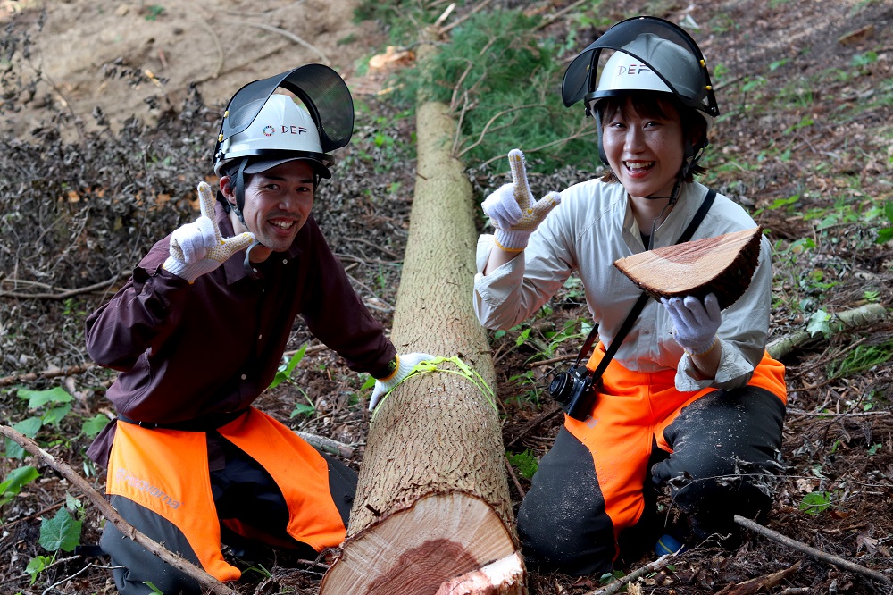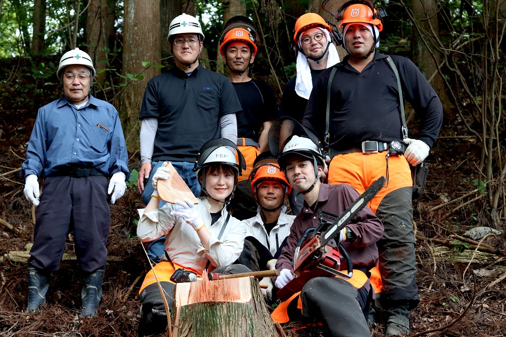 「メキ、メキ、メキ・・・ドゴォォォォーーーン!」。上空を流れる風向きを確認しながら、クサビで最後の一押しをしたところで、伐採木は目的の方向に美しくしなやかに倒れていきました。熱気と感動が冷め止まぬ現場は、毎度恒例の記念撮影へ移っていきます。ミカミの“やらせ”で「デフのイェーイをお願いします!」とお願いすると、Kさまも快く笑顔で“やらせ”にお応じてくれました(笑)。ミカミの“やらせ”はこれだけでは終わりません!「木こりさんたちもご一緒にお願いします!」と語りかけると、「え、なになに、マジ?」という顔で、恥ずかしがり屋さんの木こりさんたちも、集合写真でニッコリしてくれました。う~ん、撮れ高上々です!!