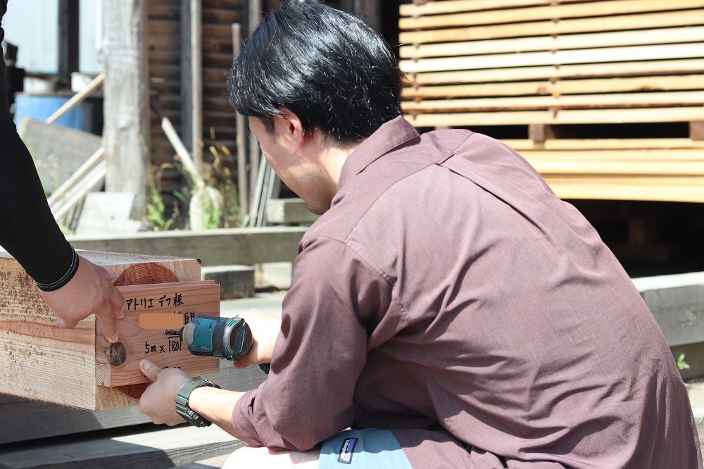 製材が終わると、こちらもお馴染み「私の大黒柱です!」を示すプレートが、お施主さまの手で取り付けられます。あっという間の2日間でしたが、本稿では語り尽くせない魅力が、ギュッと凝縮された特別な2日間だったことと思います。この後、大黒柱は約60℃での中低温乾燥の工程を経て、昔ながらの天日干し=天然乾燥に移されました。