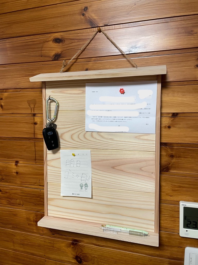 コルクボードってよくあるけど、結構画鋲が抜けやすいと思いませんか? 今回はDEFの家の水まわりやお風呂の壁に使うヒノキの板を使いました。 画鋲など丁度いい刺し心地で抜けにくいんです。 そして、メッセージを貼る度にお部屋にもヒノキのイイ香りが。