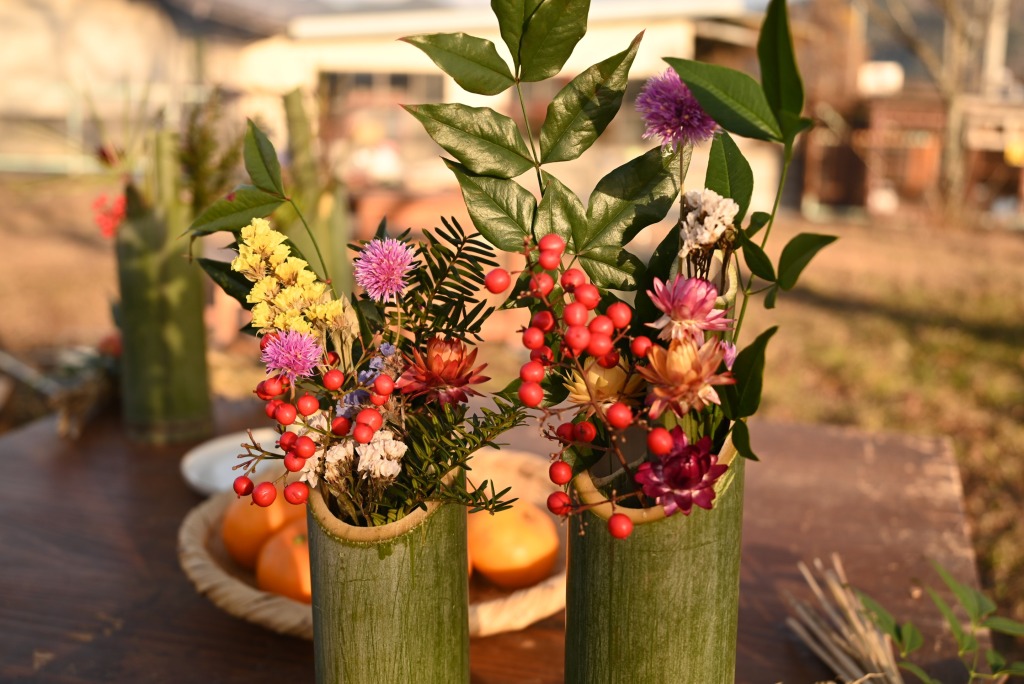 たくさん用意された、門松作りに必要な竹、松、南天の実や葉、花材を選びます。