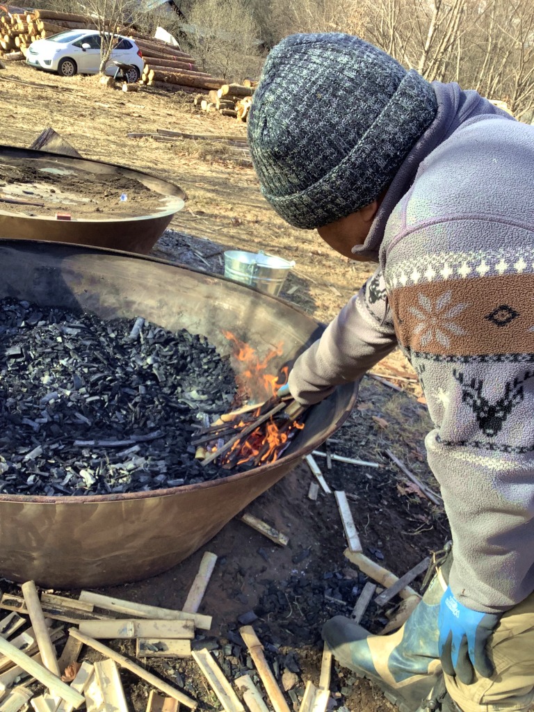 雪が舞う中、ベテランスタッフさんが丁寧に竹を並べて火を起こします。