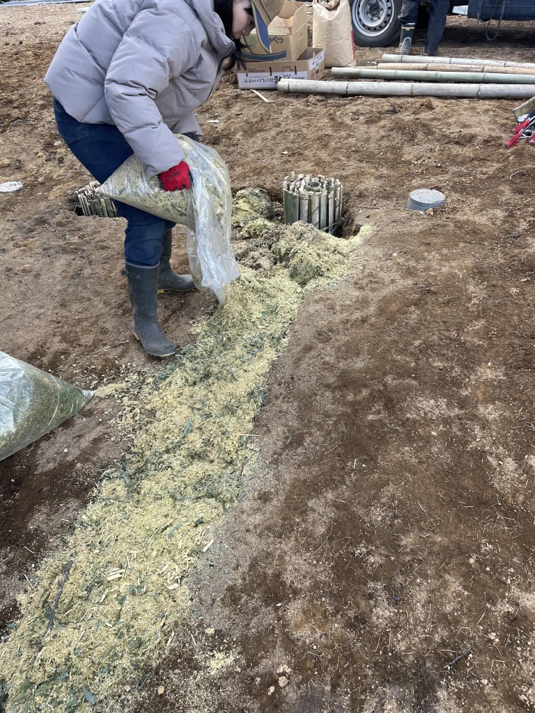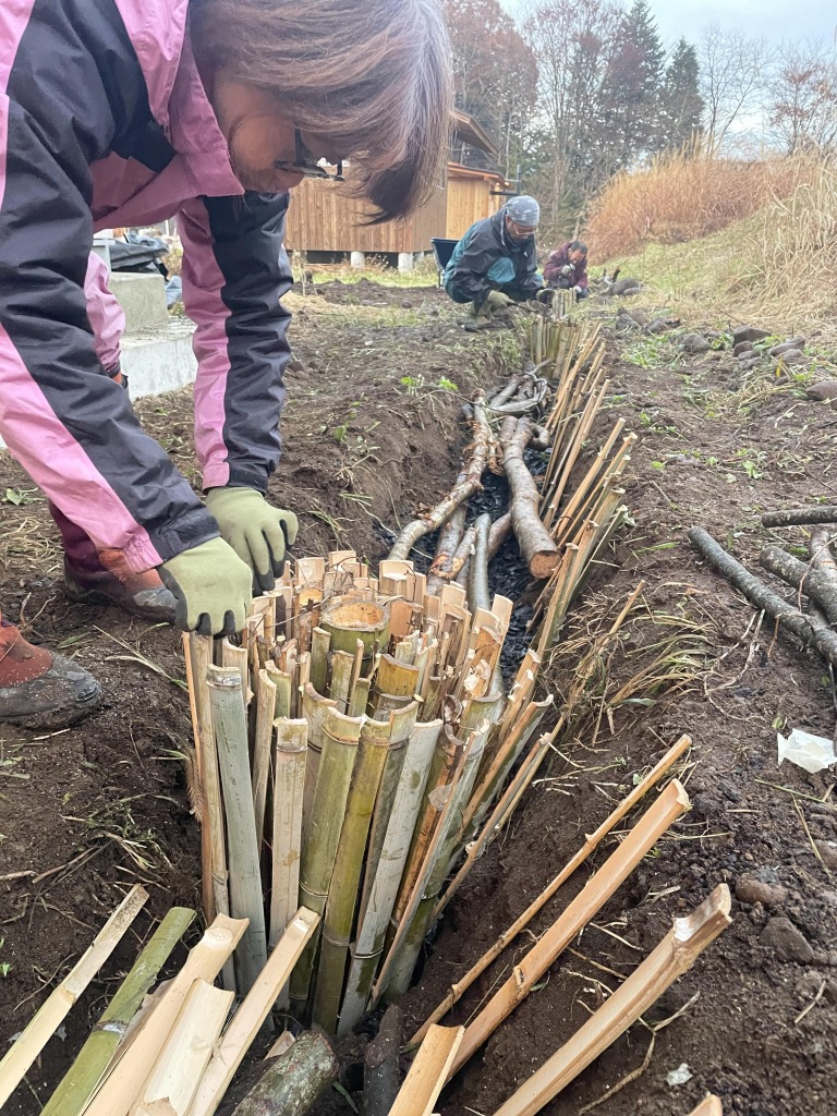 穴を掘り、竹炭・木・木枝・竹・竹チップを使います。