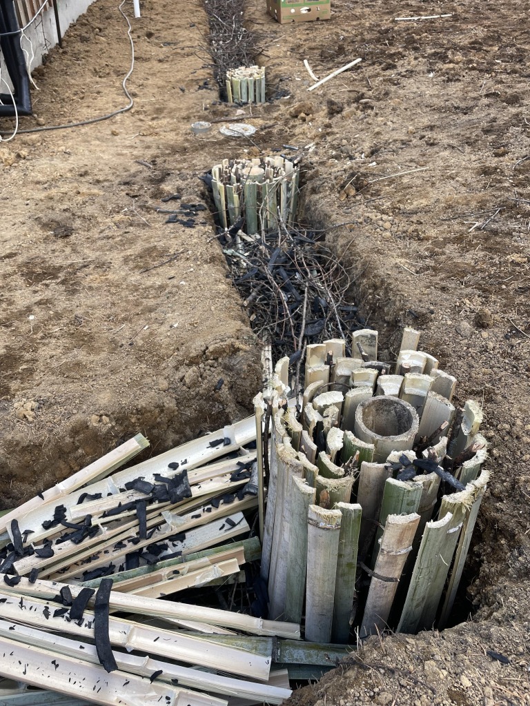 【点穴に竹炭、竹や枝を使って空気の通り道をつくります】