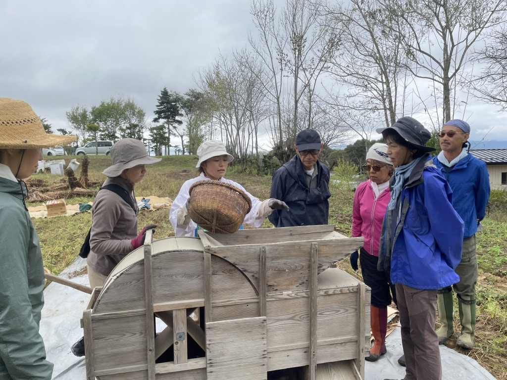 歴史の教科書に出ていたような唐箕の使い方を、平成生まれのななみんが参加者のみなさんに教えているところで、みな真剣に聞いています。