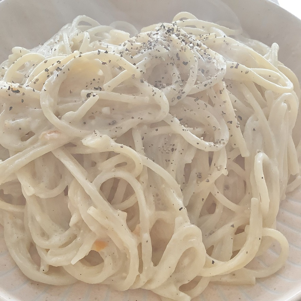入れたものは豆乳・白だし・胡椒・とろみ用米粉でフライパンで茹でたパスタと軽く炒めるだけ。