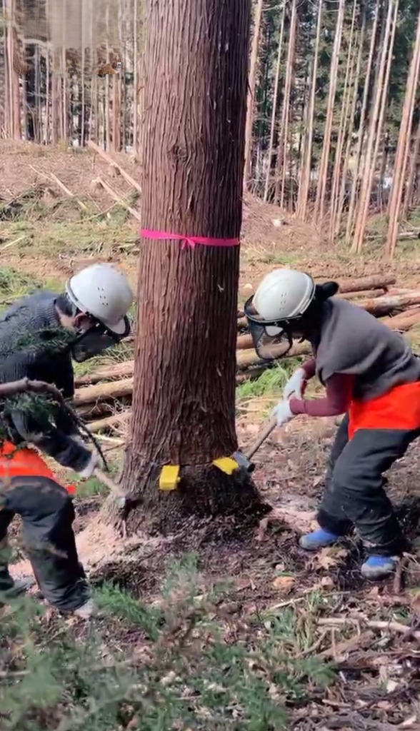 2025年3月(約1年前)宮城県の栗駒高原にあるデフの山にて、このお家の大黒柱を採りに行った際の一コマです。そう、あの時の木が今の大黒柱となっているのです。感慨深い…