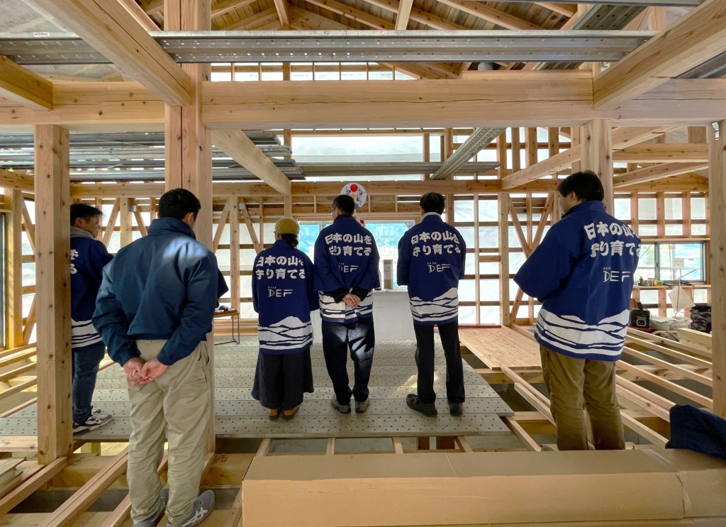 金井棟梁に倣って祭、壇に二礼二拍一礼で棟上げが無事に行われたことへの感謝と、今後の工事の安全と家内安全を皆で祈りました。