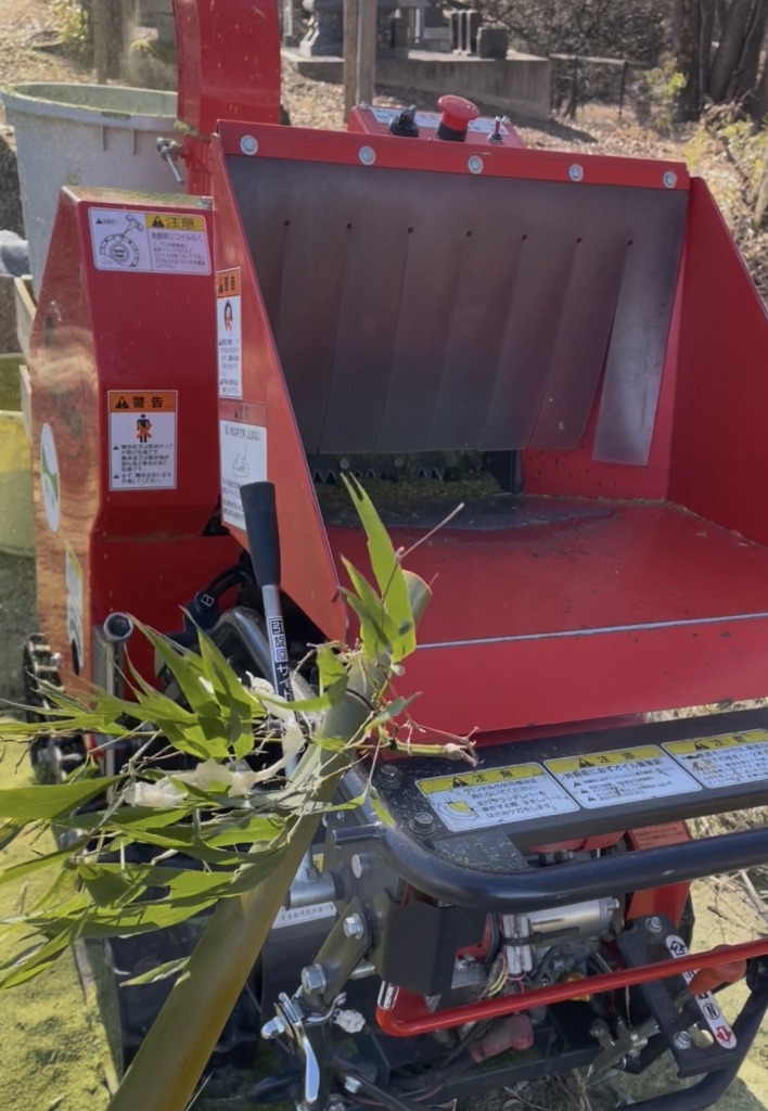 切った竹はチッパー機と呼ばれる、こちらの機械で粉砕していきます。