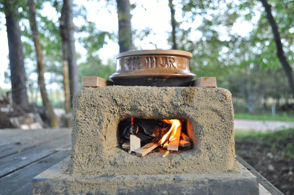現場でのお勉強の後は、家づくりに使う土と同じ土を使った、ミニかまどで一組づつご飯を炊いて、お結びにしてお持ち帰りいただけます。