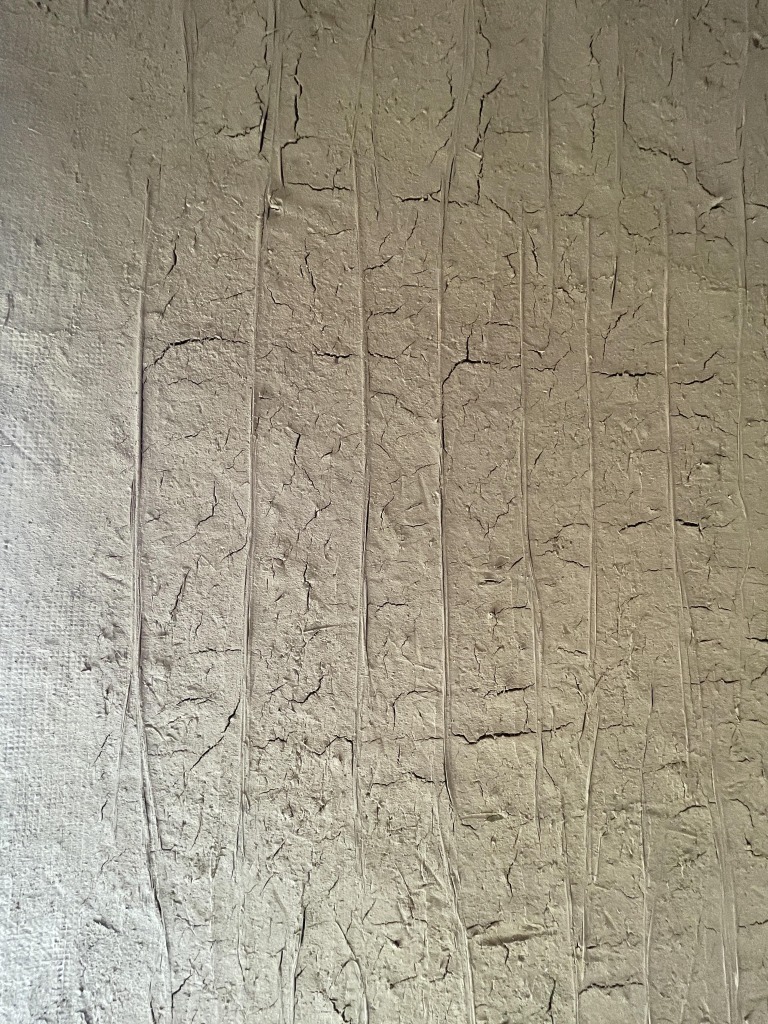 いい感じにひびが入り、この後は川砂の入った中塗り仕上という工程に移ります。