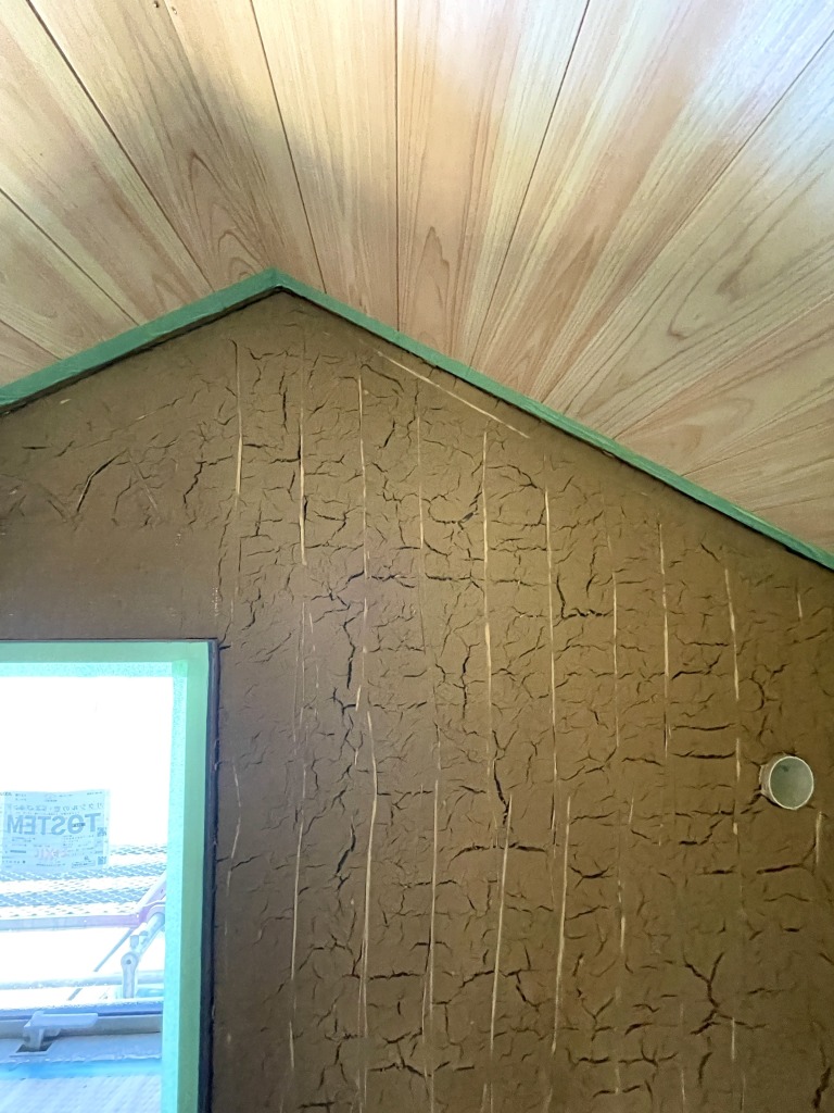 木の木質断熱材は既にしっかりと施され、土壁の荒壁土での仕上げが終わり、乾燥中です。
