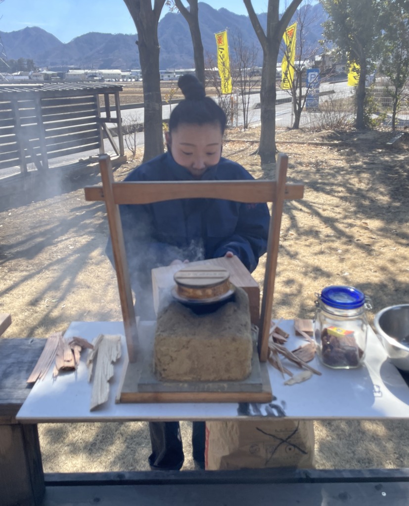 土壁と同じ土で作ったミニかまどで、一緒にご飯を炊きましょう!