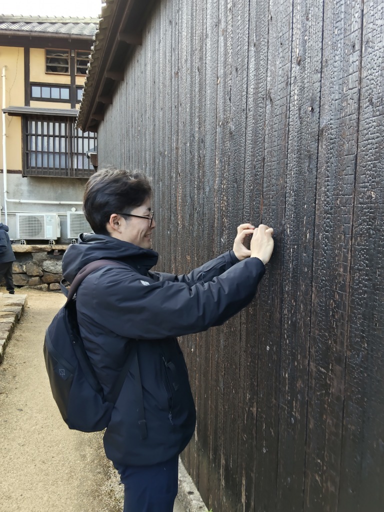 焼杉の板塀を接写する川尻監督