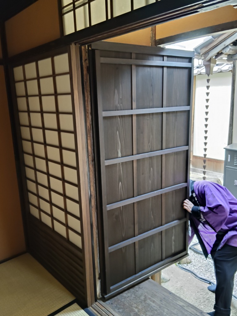 井上家住宅でも建具の納まりが工夫されており、分厚い扉を重ねて畳んで省スペースに収めるようになっていました。
