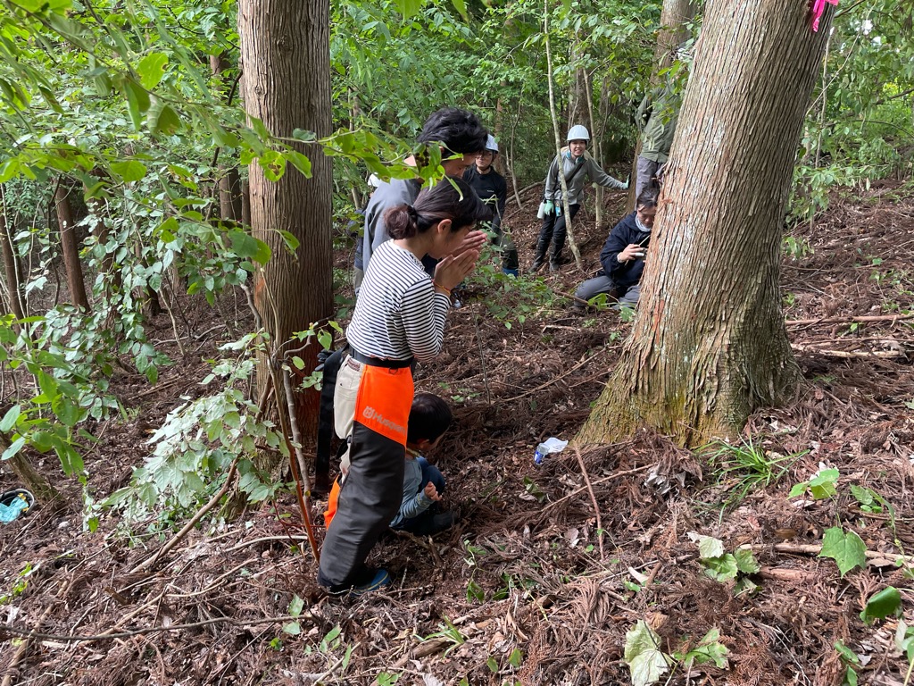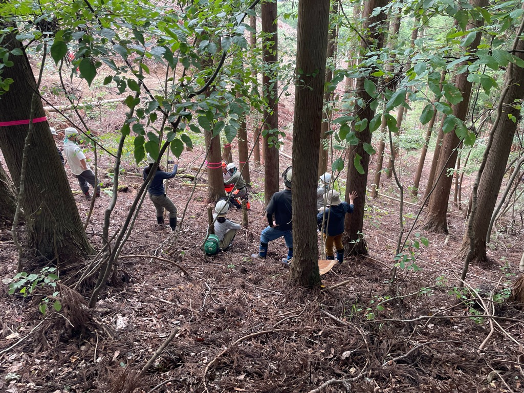 伐採当日も3つの候補の木の中から勇気をもって、一番切りづらい上の方に立つの木を選んでくれました。 (ほめてるの?) 伐採場所は斜面が多く、道があるわけではないので登るのはとっても大変です。