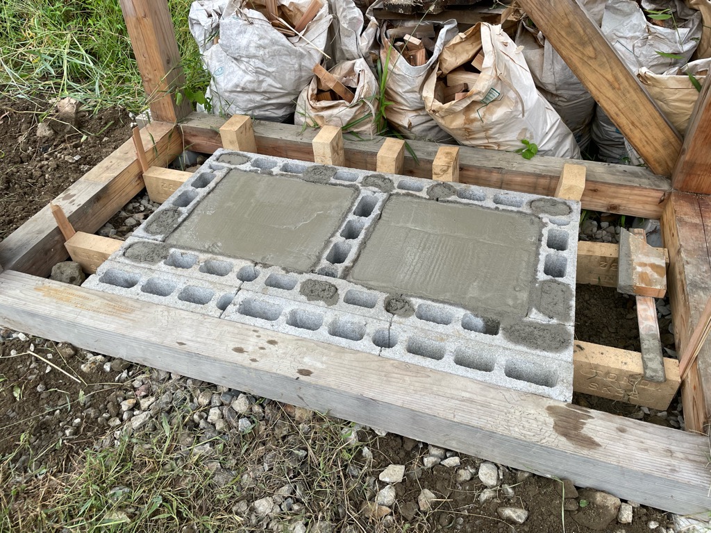 組み立ての前に星野建設が下の写真のように地面を掘って砂利を敷き、ブロックを並べてコンクリートで固めてかまどの基礎を作ります。