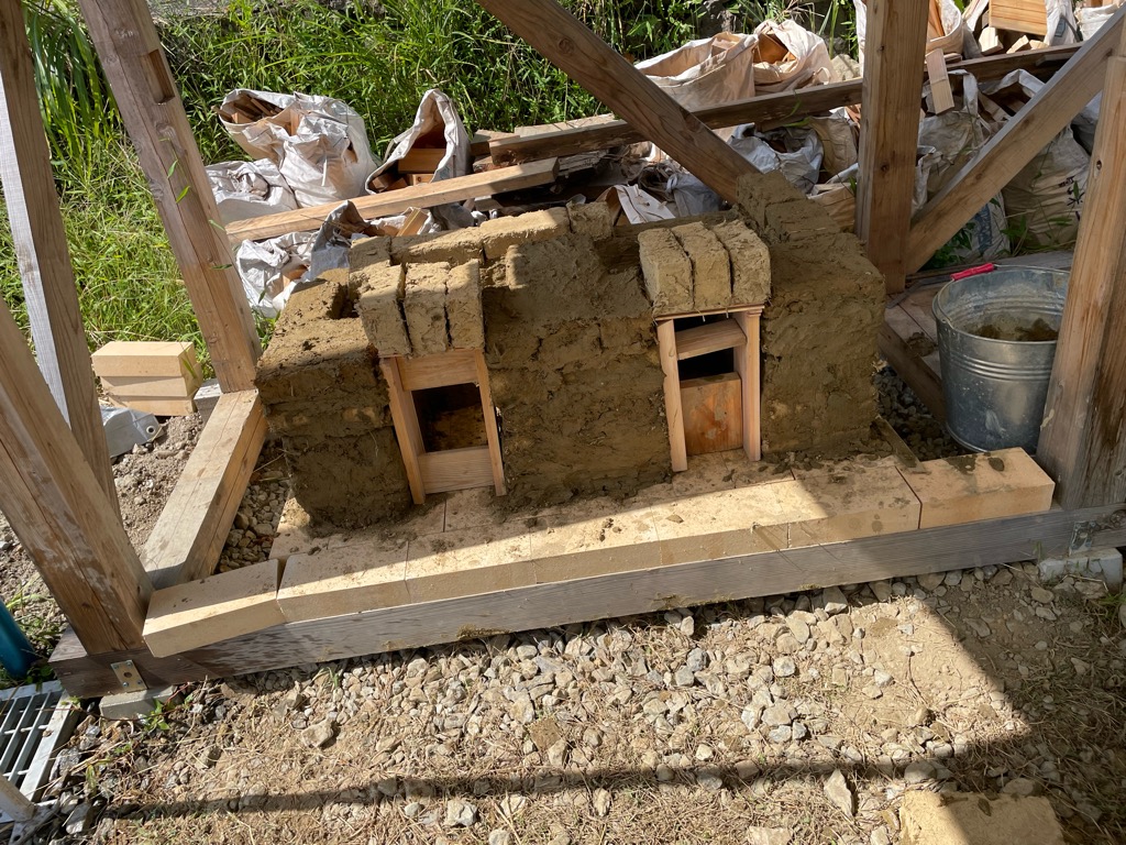 今日は前回作っておいた「日干しレンガ」を泥でくっつけながらかまどの形を作っていきます。