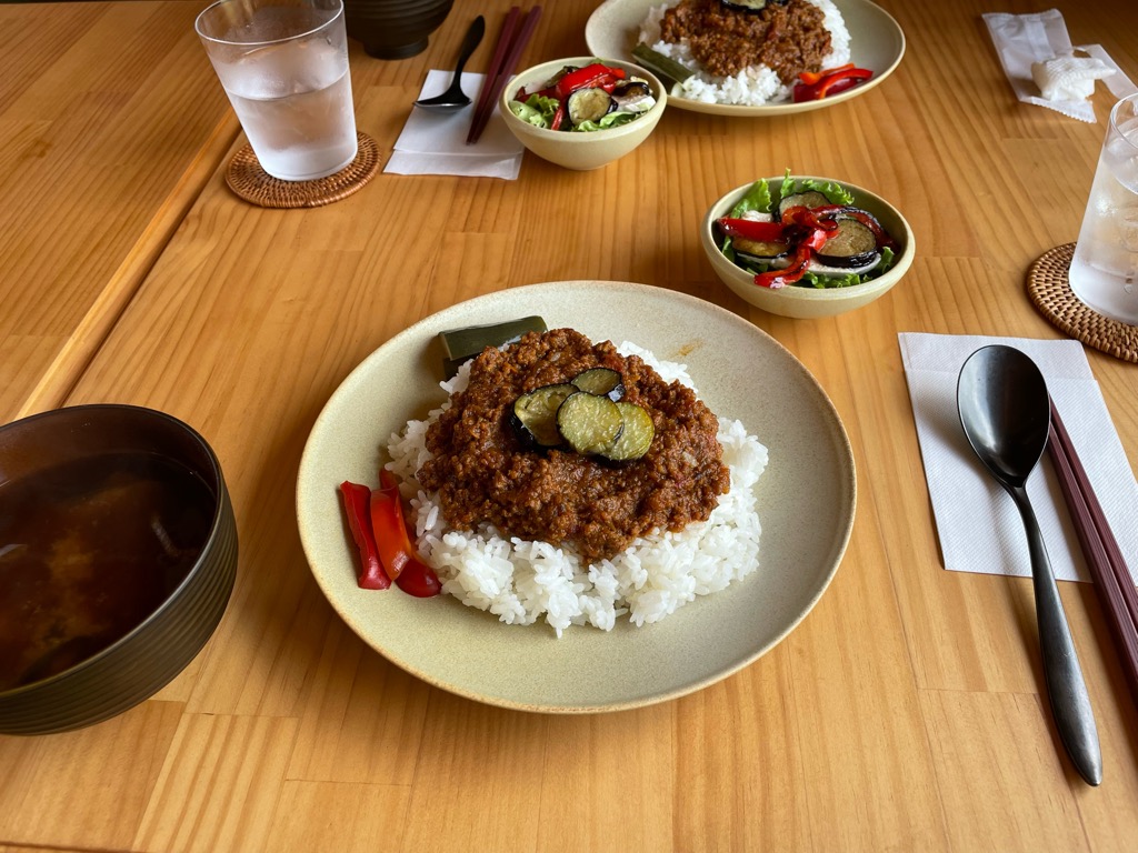 【おまけ】 今日のカフェ「森の中へ」でのランチはカレーセット! (これが目的か) いろいろなスパイスが入っていて本格カレー屋さん並みの美味しさ! ピクルスやサラダも美味しかったけど、この地区で採れた大豆を使ったお味噌汁がとってもいいお味でした。