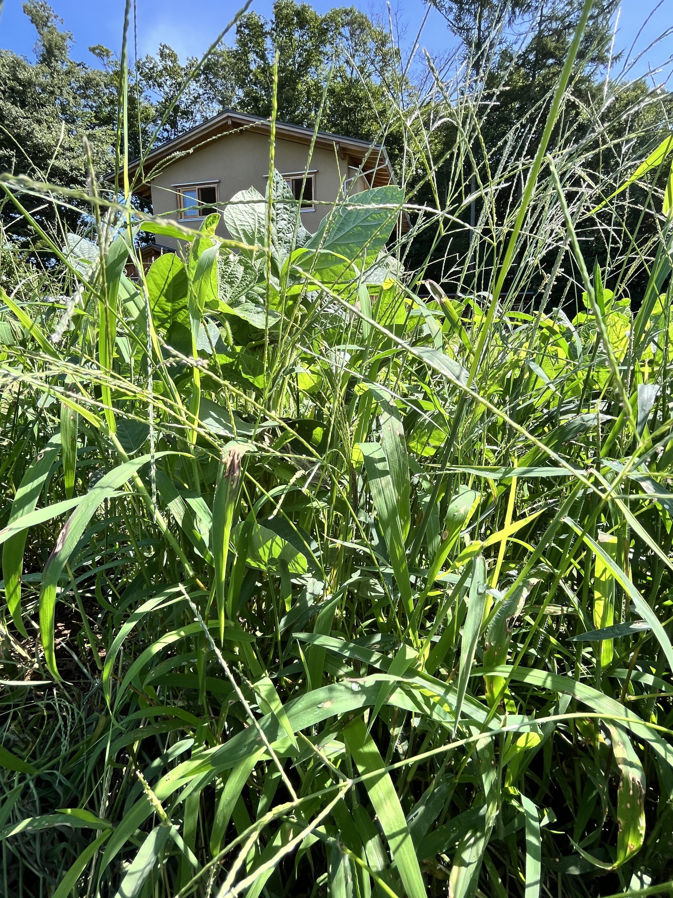 草の生え具合はこんな感じです・・これ、もちろん大豆の畝ですよ!