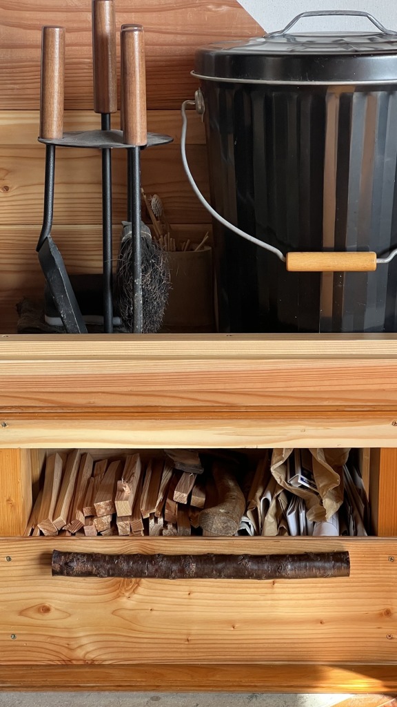 散歩から帰宅したら薪仕事です。我が家では、10月下旬から段階的に薪ストーブを着火してきましたが、11月になると冷え込みが一段と厳しくなり、薪ストーブも本格運転に移行しています。連休を使って、薪ストーブアイテムが並ぶ作業棚を綺麗に掃除し、焚き付けも手斧で一気に作りまくります。ボサノバでも流しながら、ゆったりとした気分で、黙々と・・・なんだかんだで、作業後に棚全体をやすり掛けして、仕上げにみつろうワックスまで塗ってしまいました。
