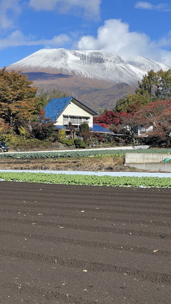 11月3日(祝)、未明からの冷たい雨が止んで雲が晴れると、遠景の浅間山が冠雪した姿で現れました。紅葉のピークと冠雪が被るのって、実は結構珍しいのでは?と思いながら、自宅近くの畑からパシャリ。周辺をウロウロしていたら、ご近所の奥さまから極太の新鮮大根をいただいてしまいました(笑)。いつもありがとうございます。
