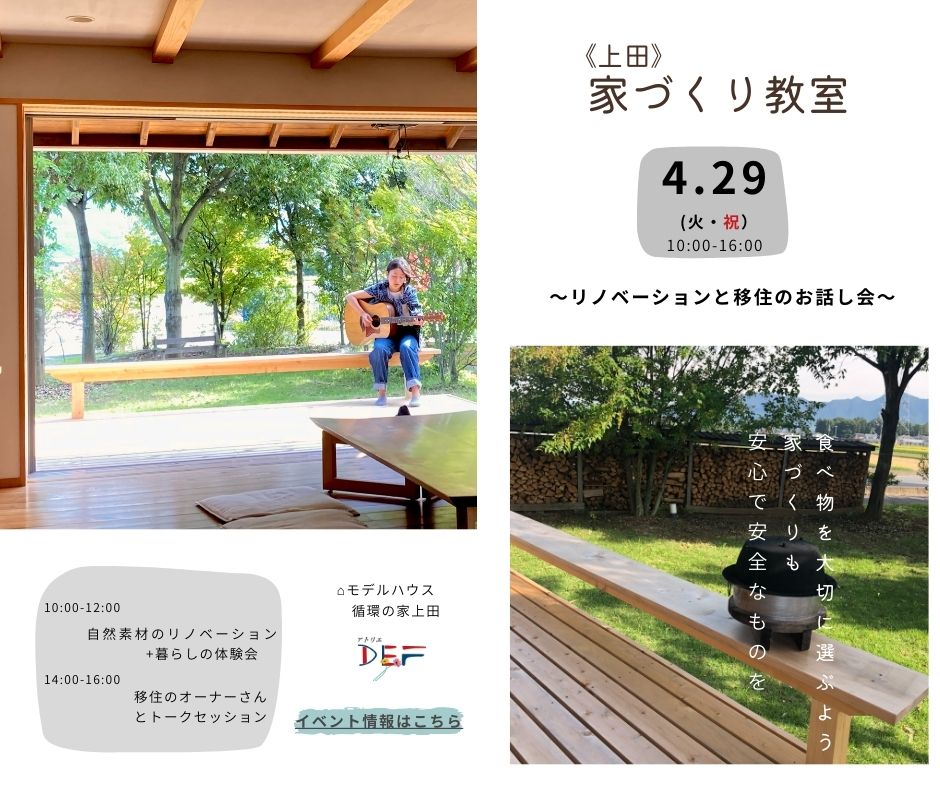 デフが使用する素材のお話しや、薪ストーブやかまどといった暮らしの体験をしていただく内容となっていますので、これから移住をお考えの方、いま土地を探しているという新築ご希望の方、モデルハウスの見学だけでもしてみたい…という方も、家づくりの参考になりますので是非ご参加ください。